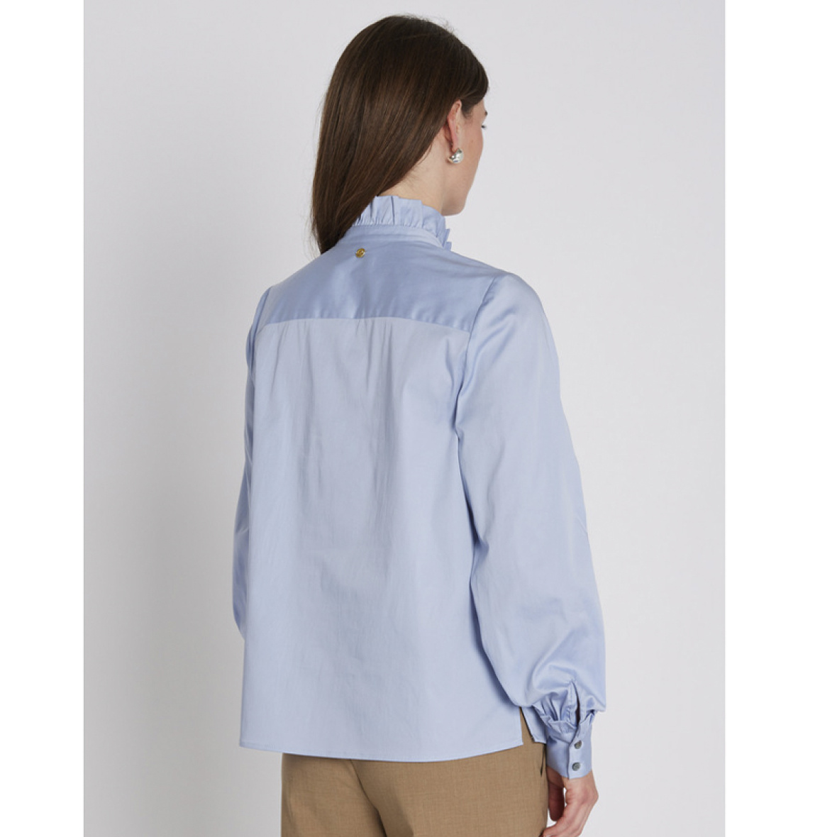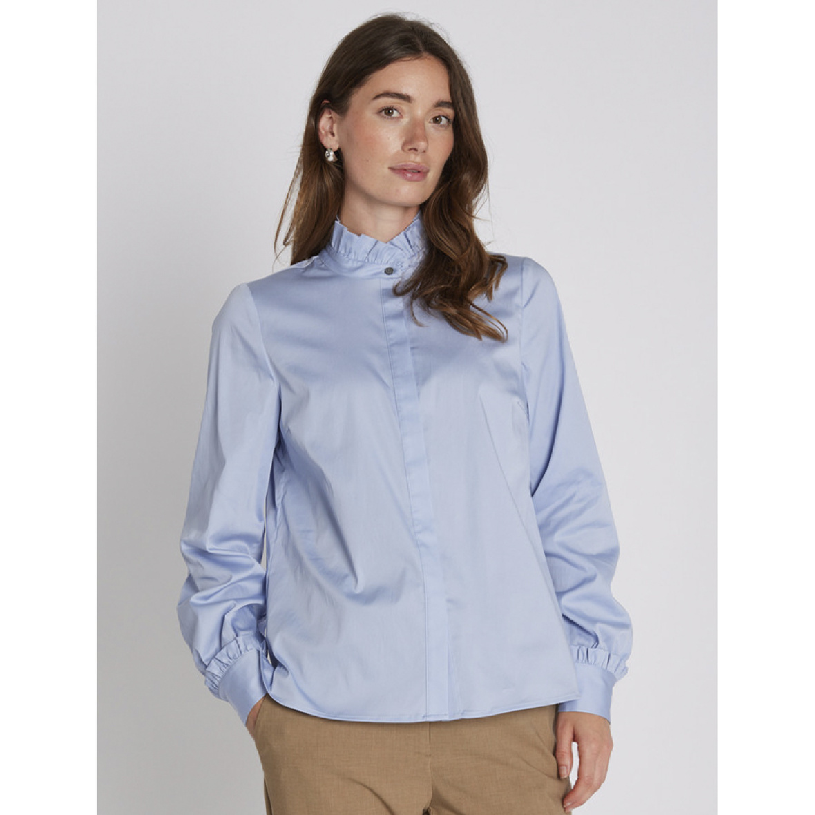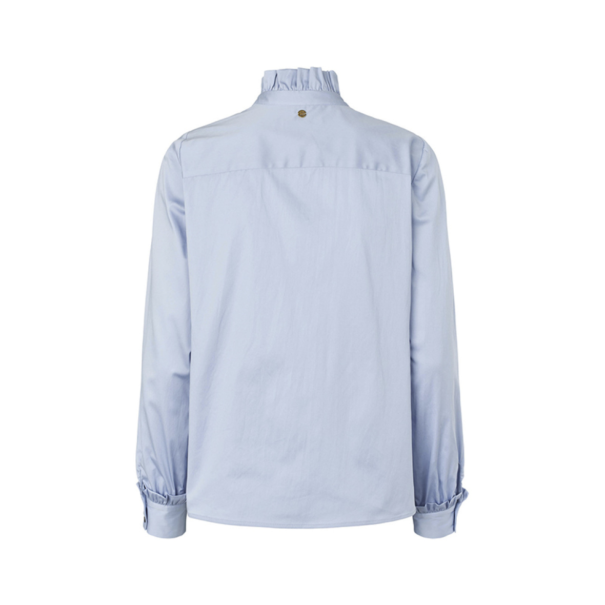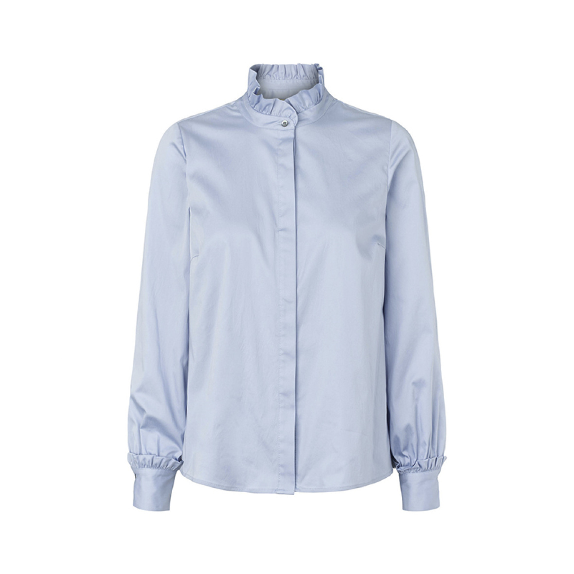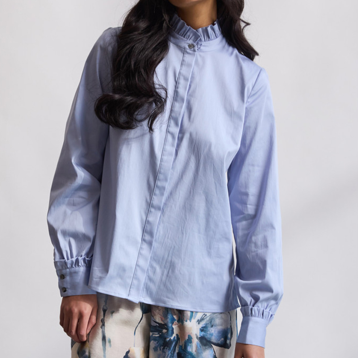 Den har en lille flæsekant ved halsen og en skjult knaplukning foran.