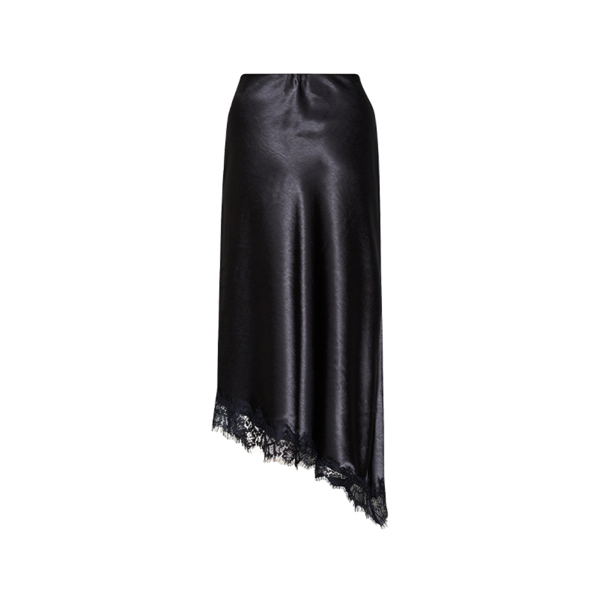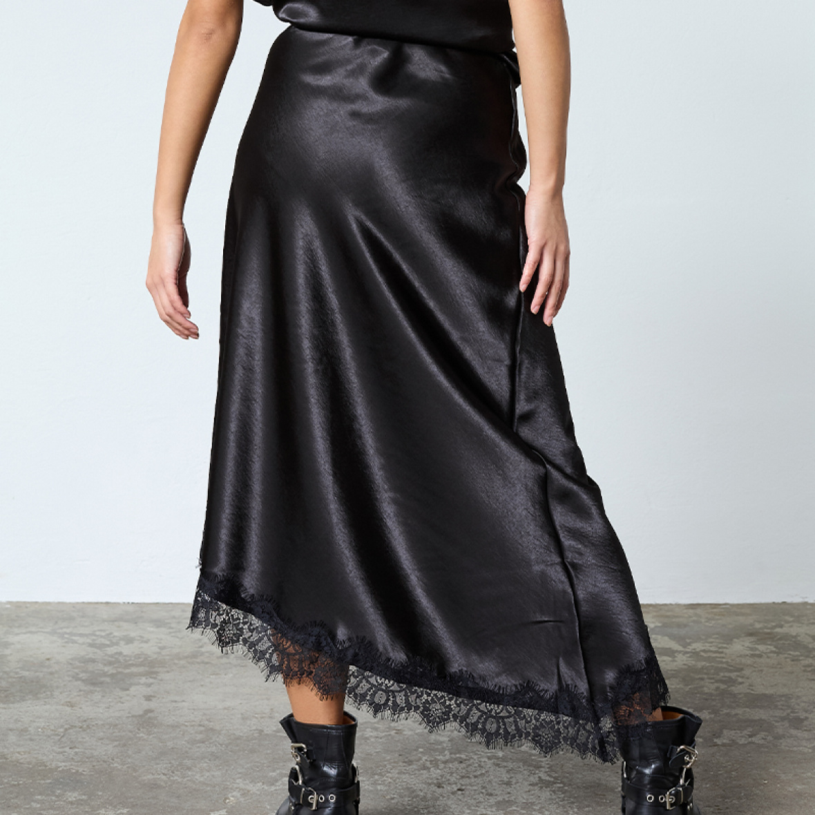Nederdelen har en smuk, glansfuld overflade og afsluttes med en fin blondekant, som giver et feminint udtryk.