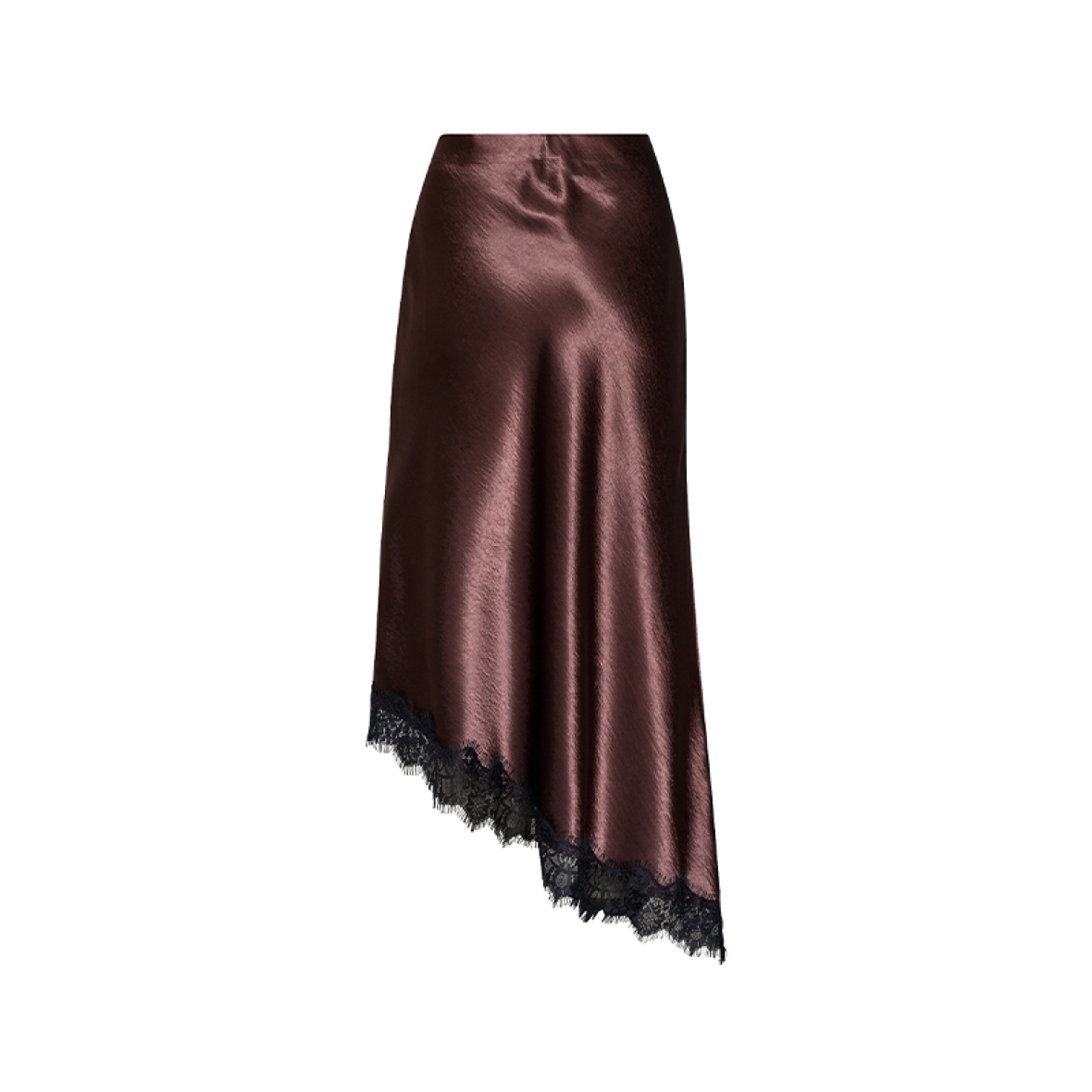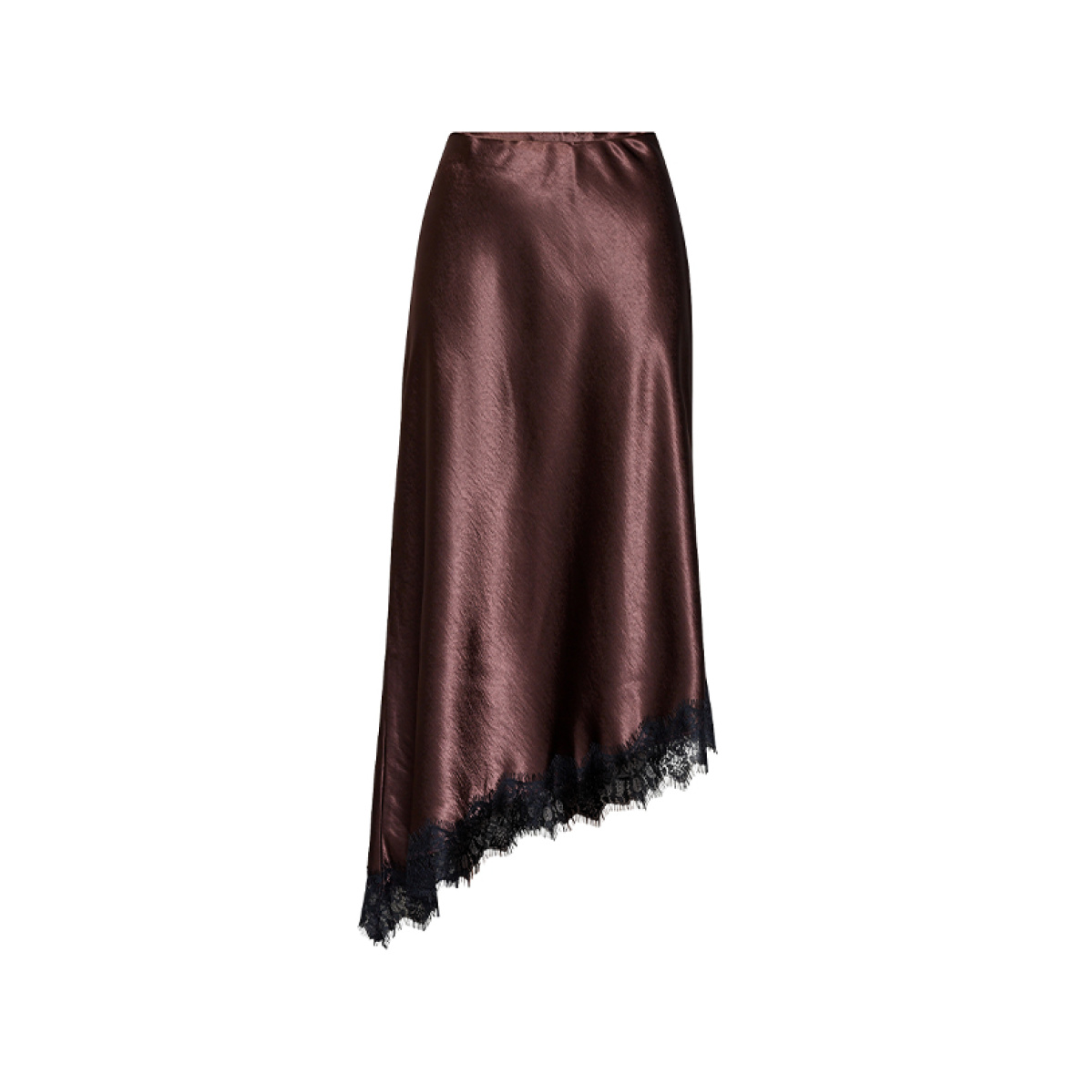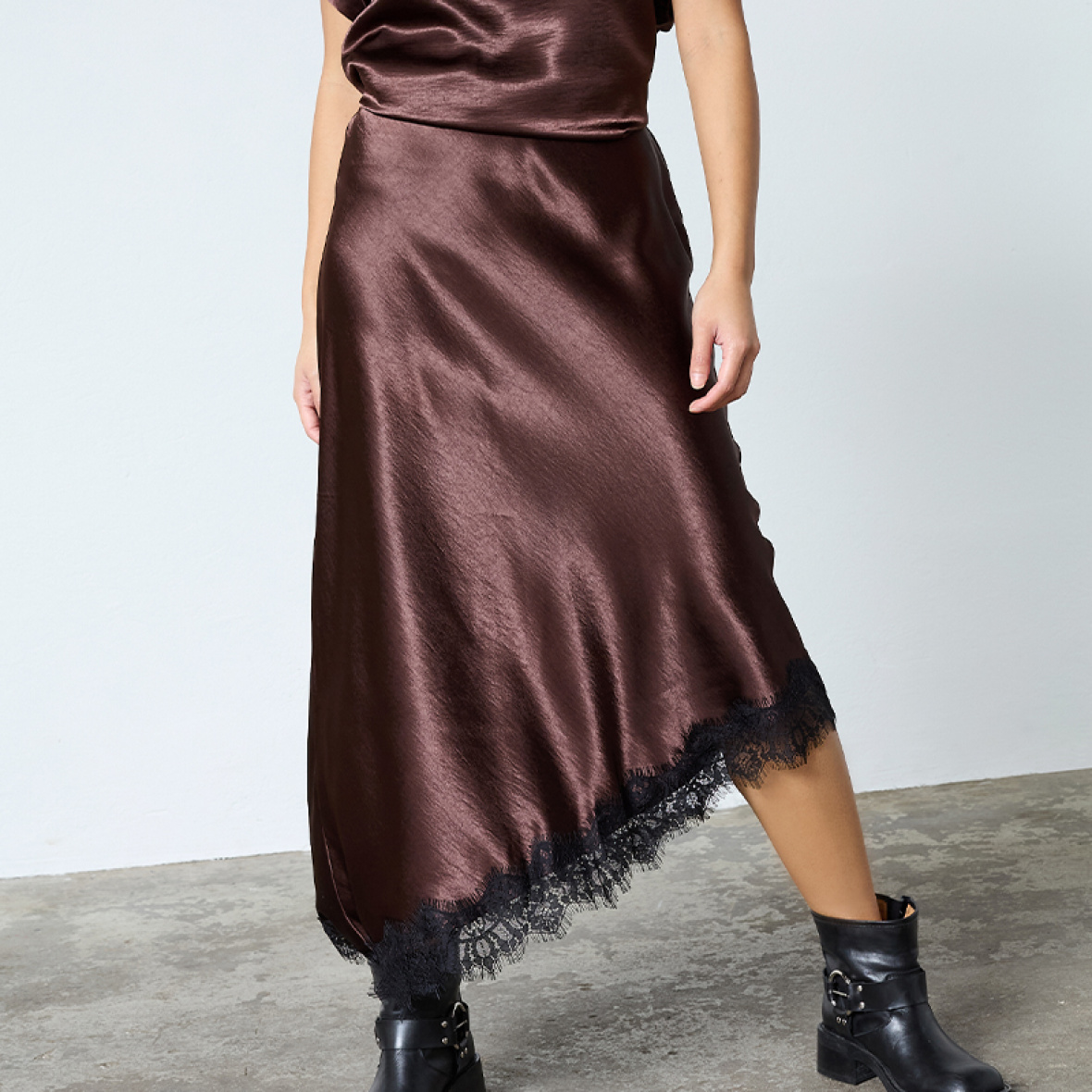 Nederdelen har en smuk, glansfuld overflade og afsluttes med en fin blondekant, som giver et feminint udtryk.