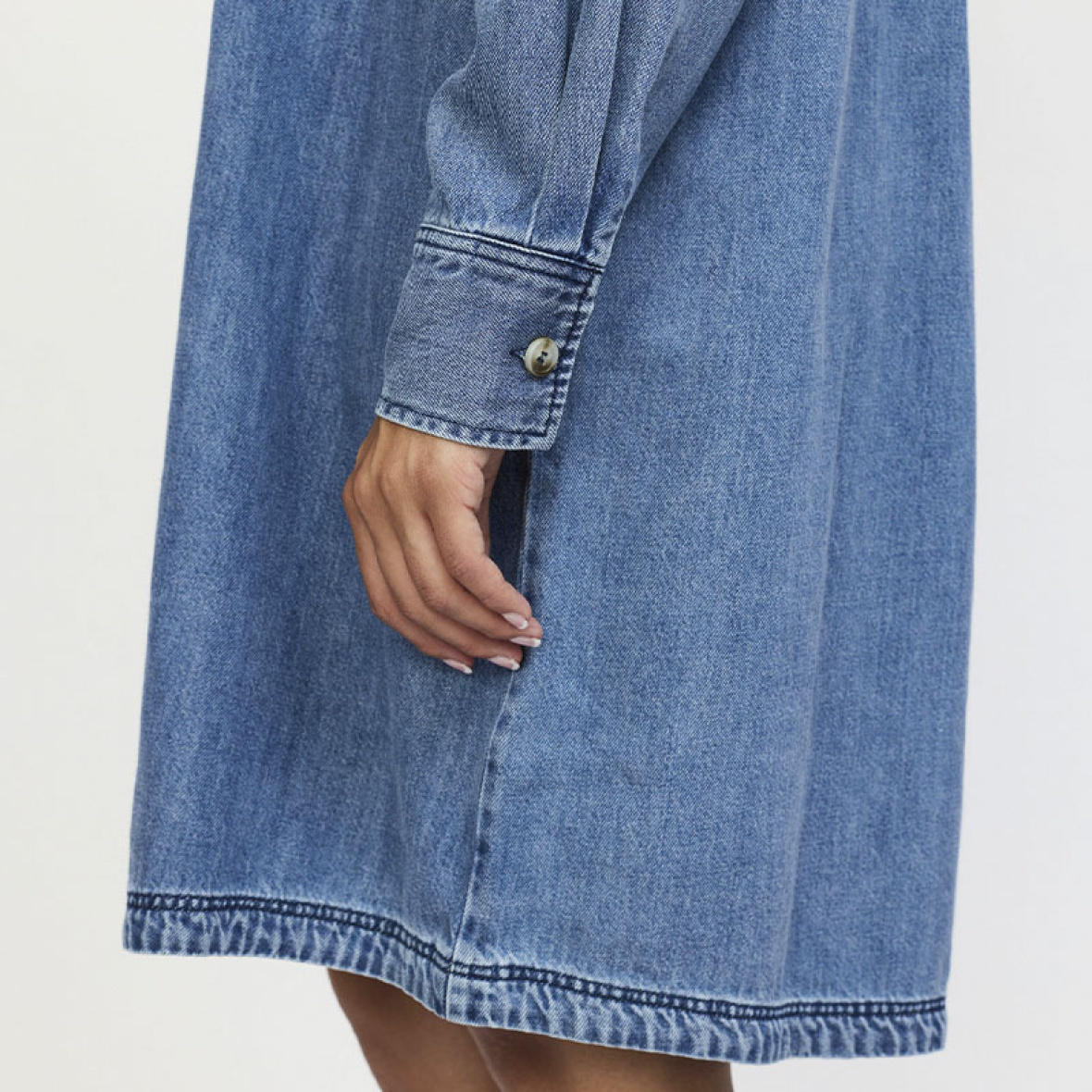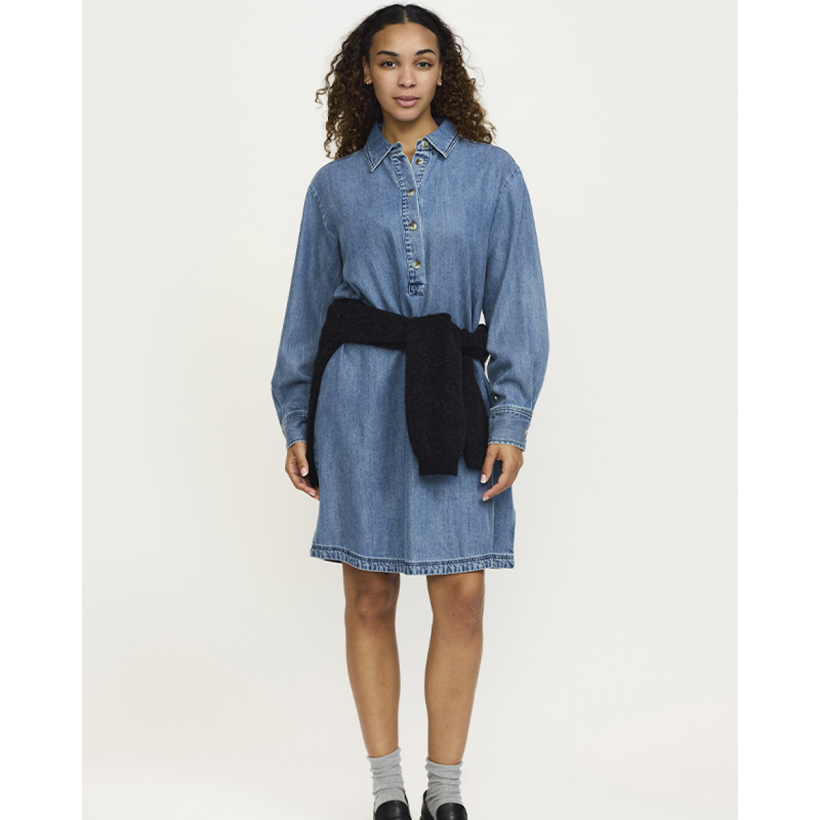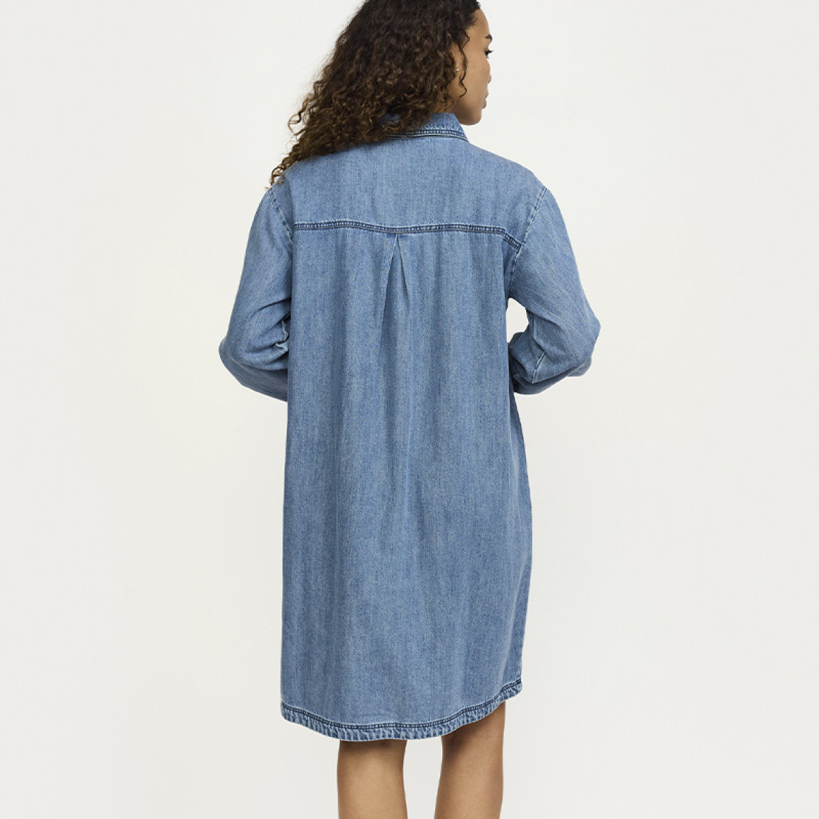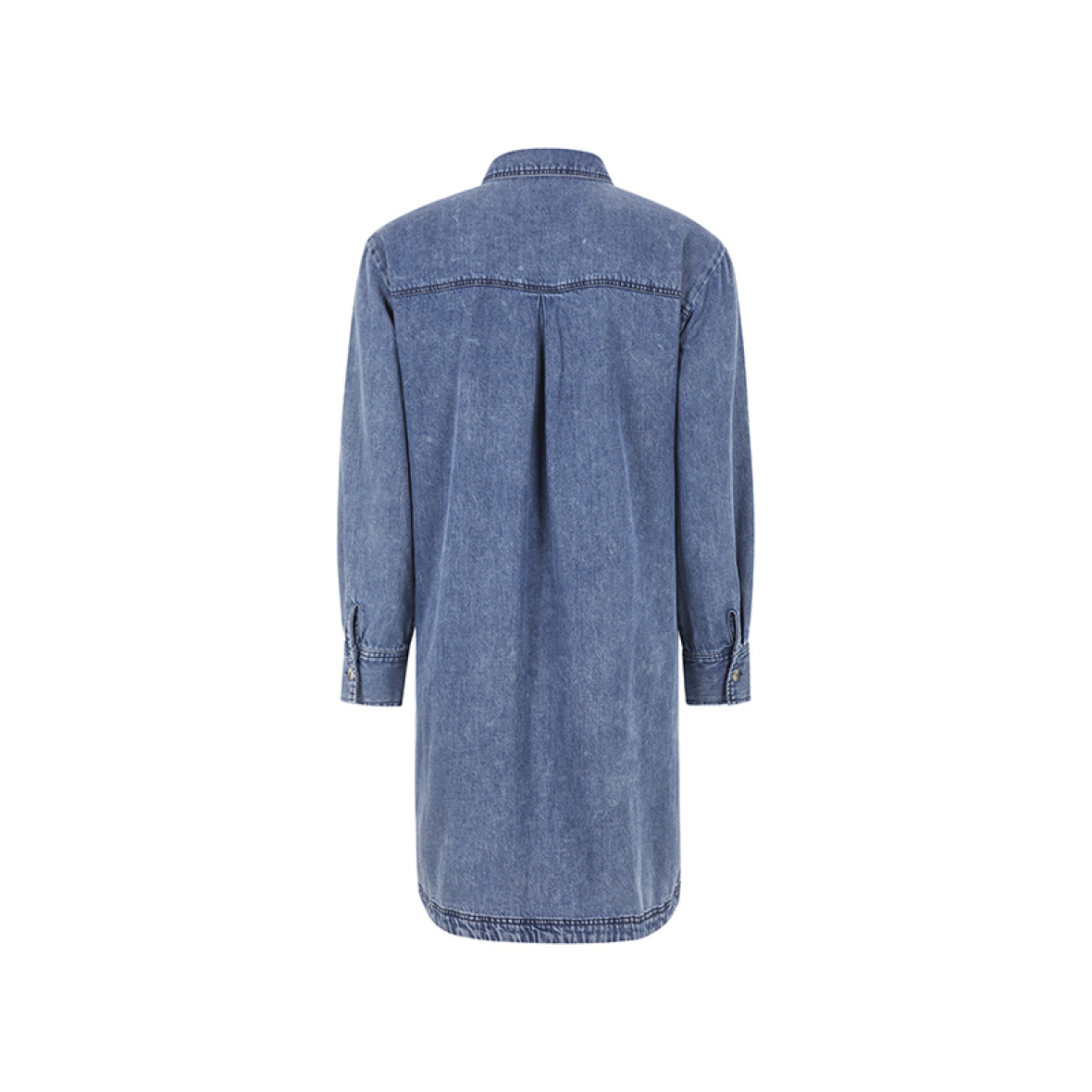 Kjolen har krave og lukkes foran ved en lille hægte samt lange ærmer med manchet.