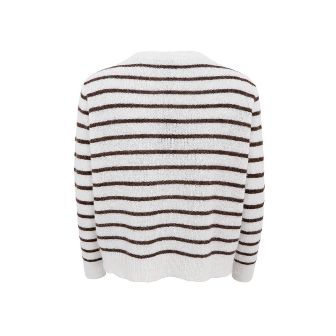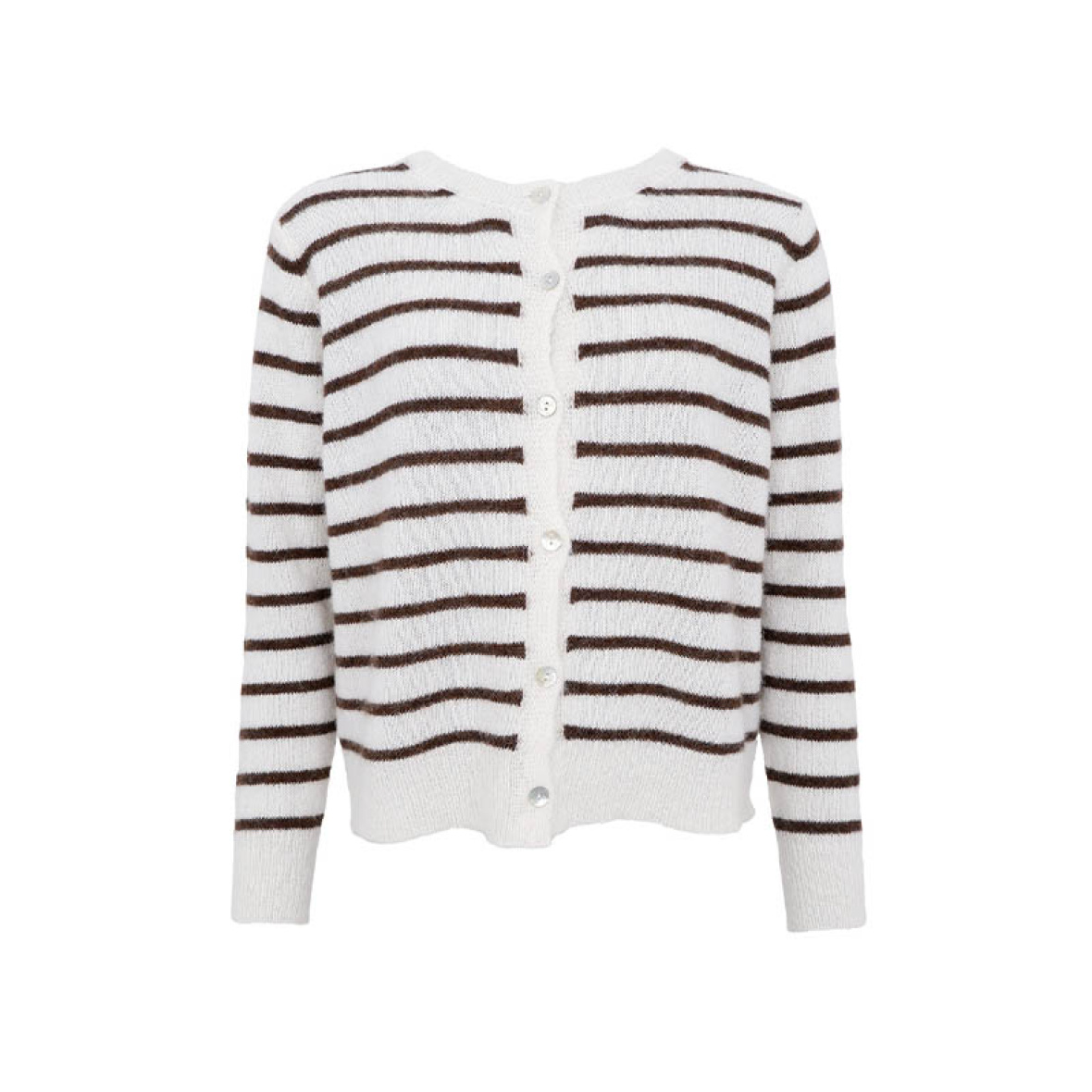 Denne stribede strikcardigan er lavet i en blød uldblanding, der giver både varme og komfort.
