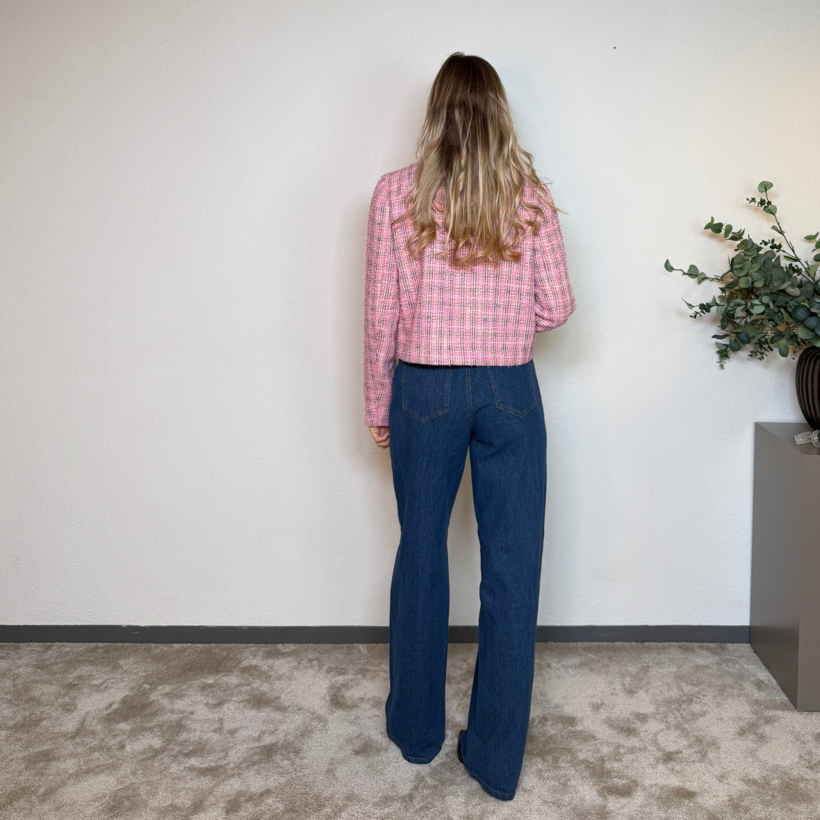 En elegant, lyserød tweedjakke i et klassisk, tidløst design.