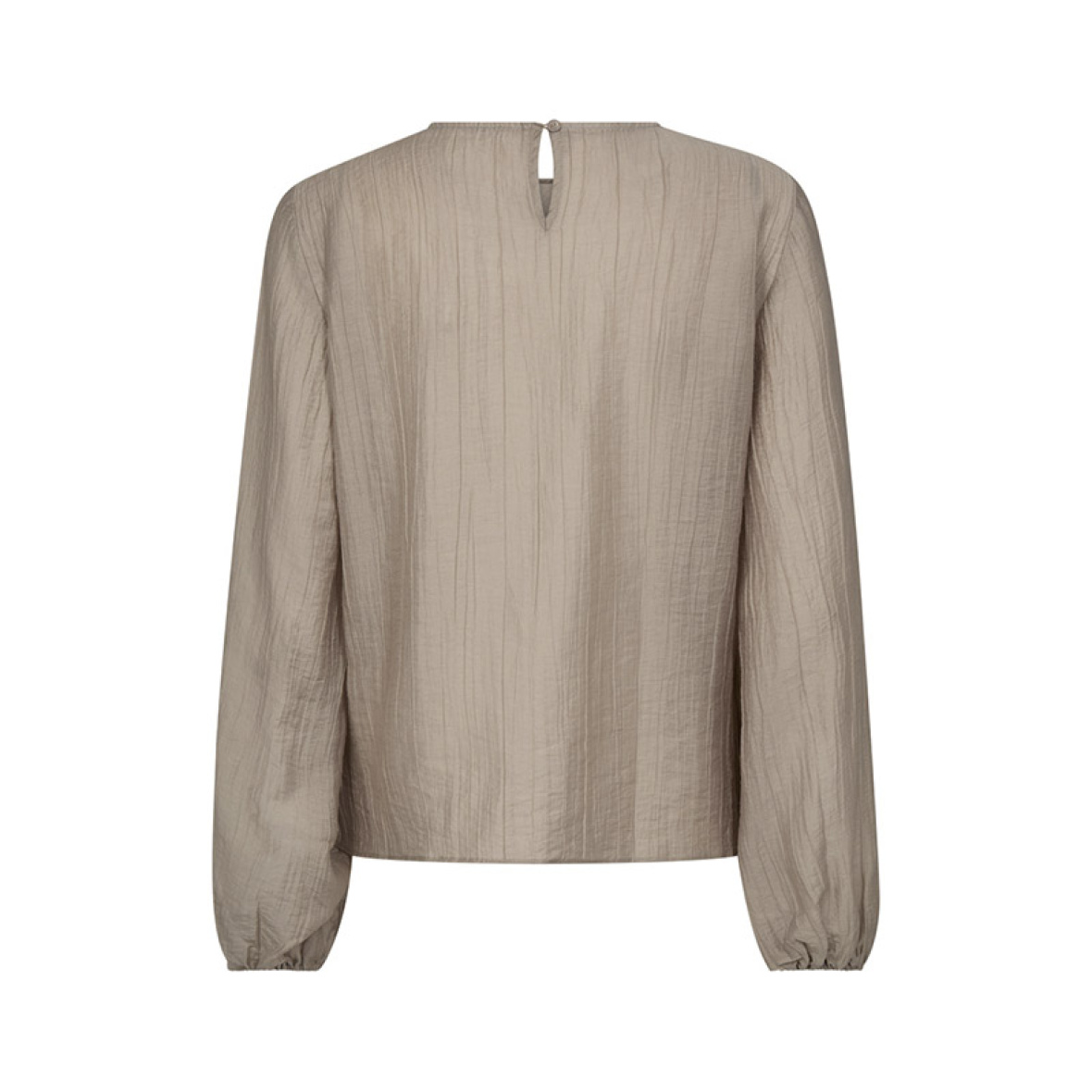 Blusen har rund hals, lange ærmer med elastik og en lille knaplukning i nakken.