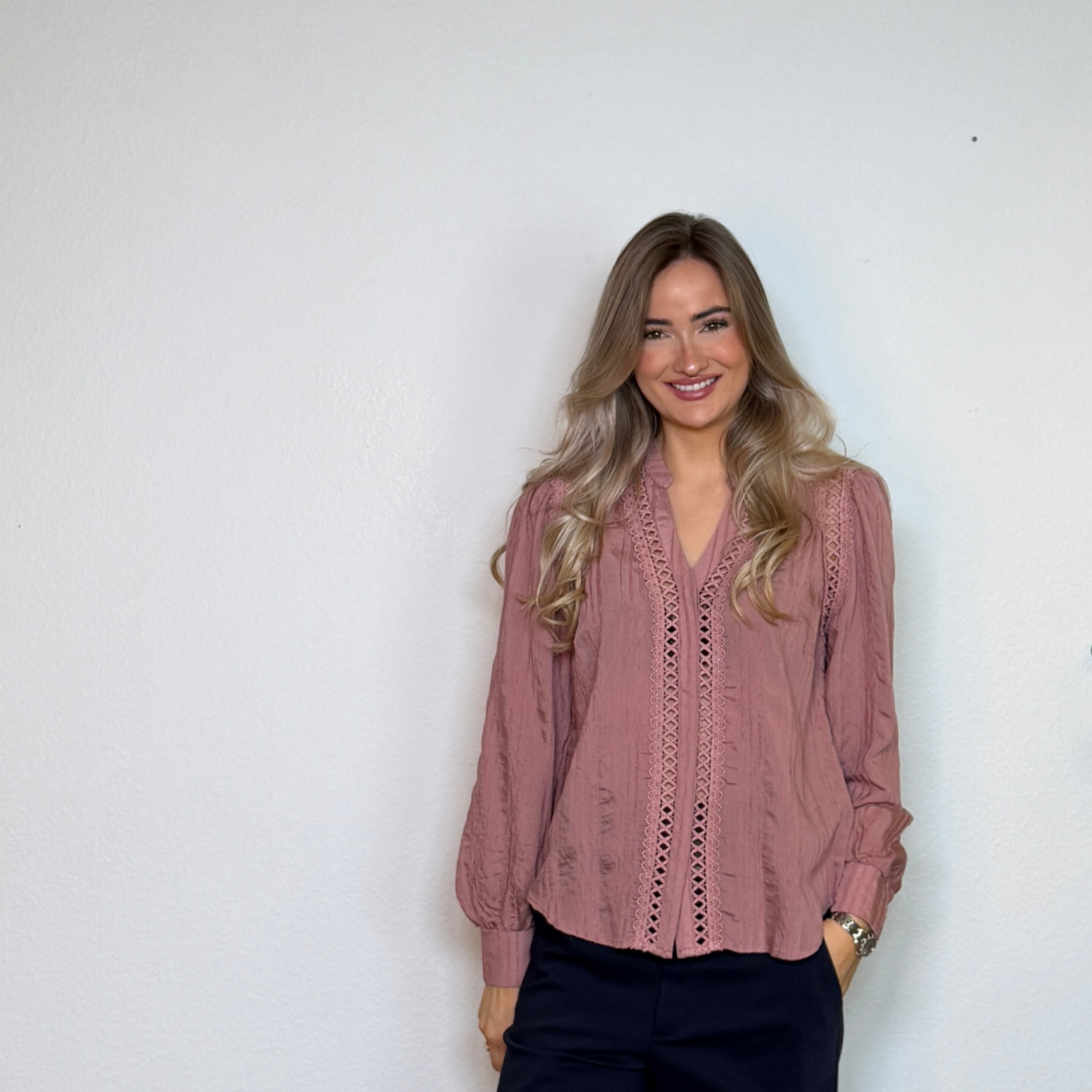 Langs knapstolpen prydes skjorten af delikate blondedetaljer og små perlemorsknapper, der tilfører et sofistikeret udtryk.