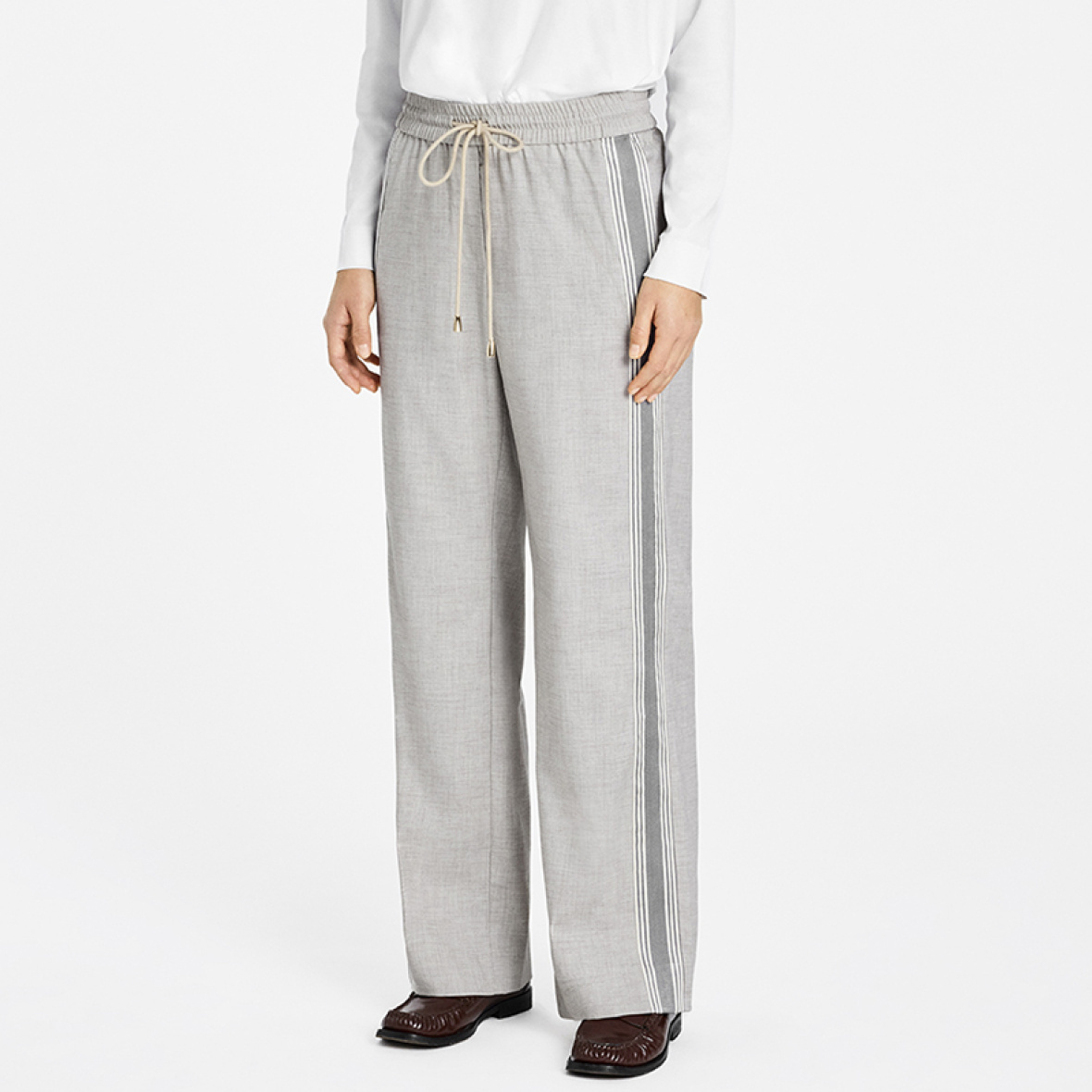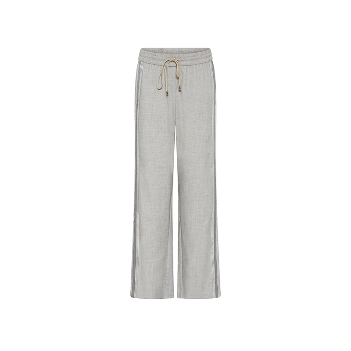 Let og behagelig buks i en lys, neutral nuance med diskrete striber ned langs siderne.