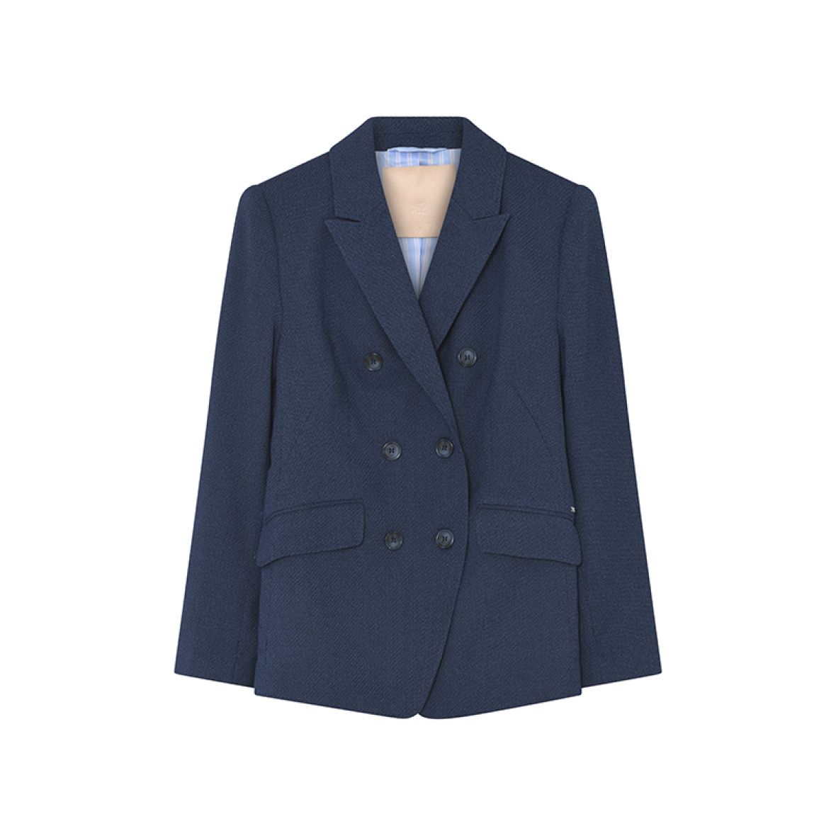 Klassisk mørkeblå blazer med dobbeltradede knapper og et tidløst, skarpt snit.