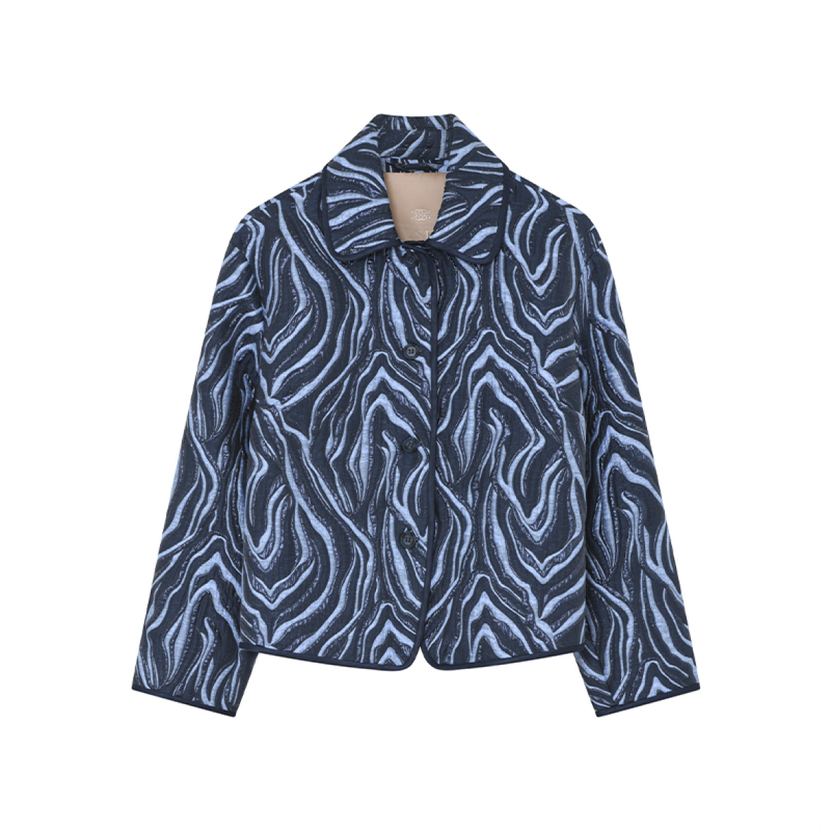 En moderne og iøjnefaldende jakke med et smukt, bølgende mønster i blå toner.