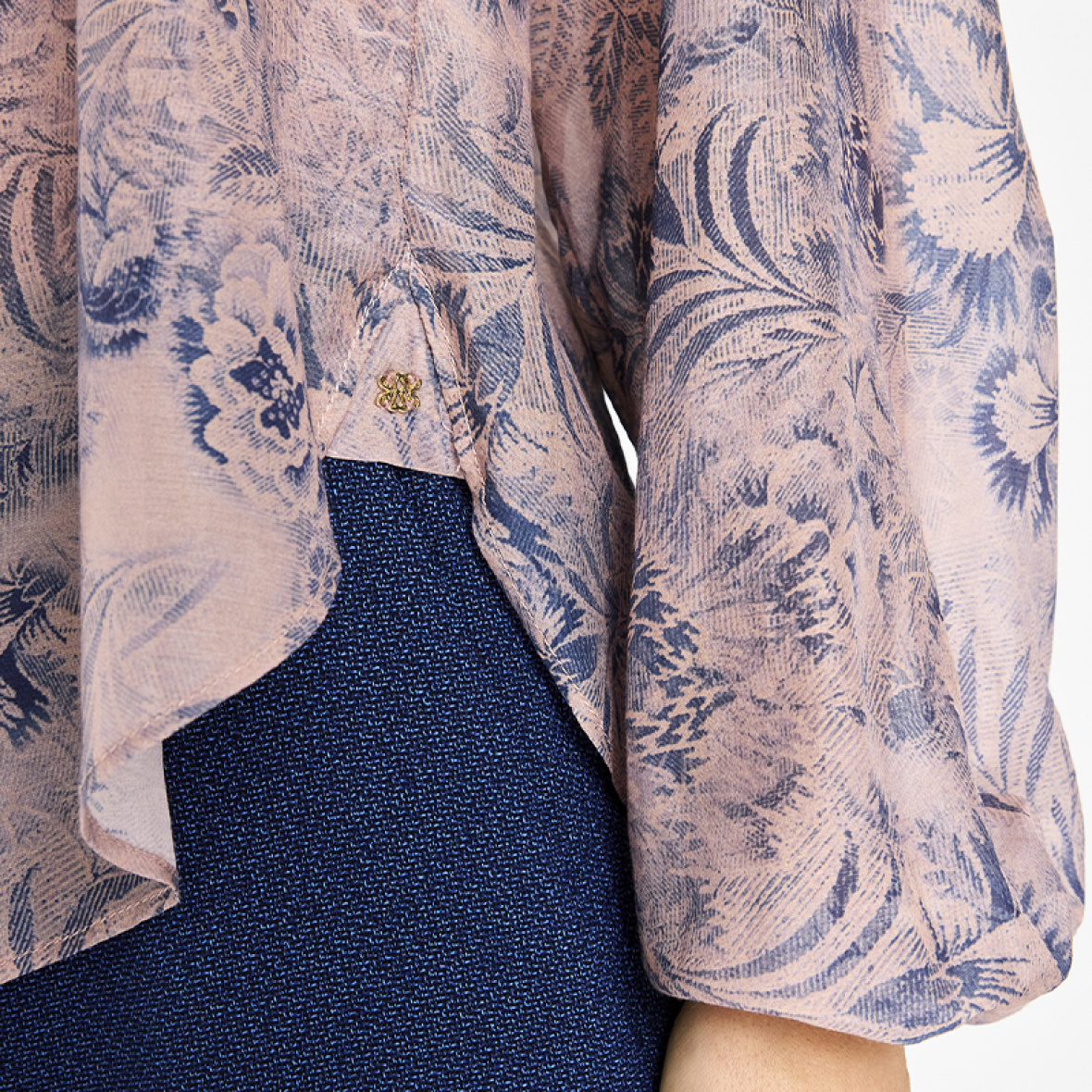 En smuk bluse i et elegant, blomstrende mønster i støvede rosa og blå toner.