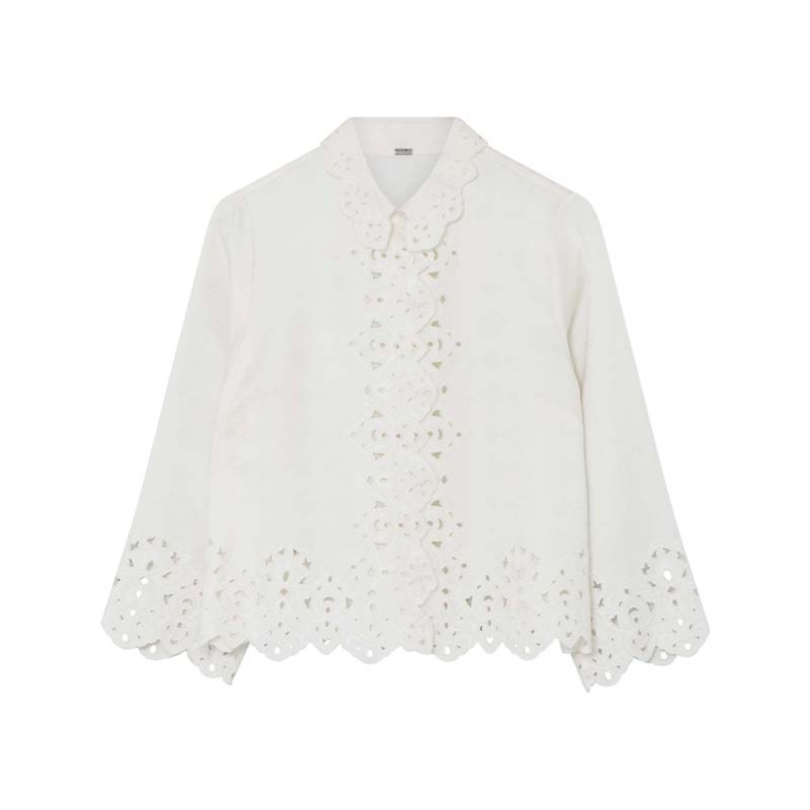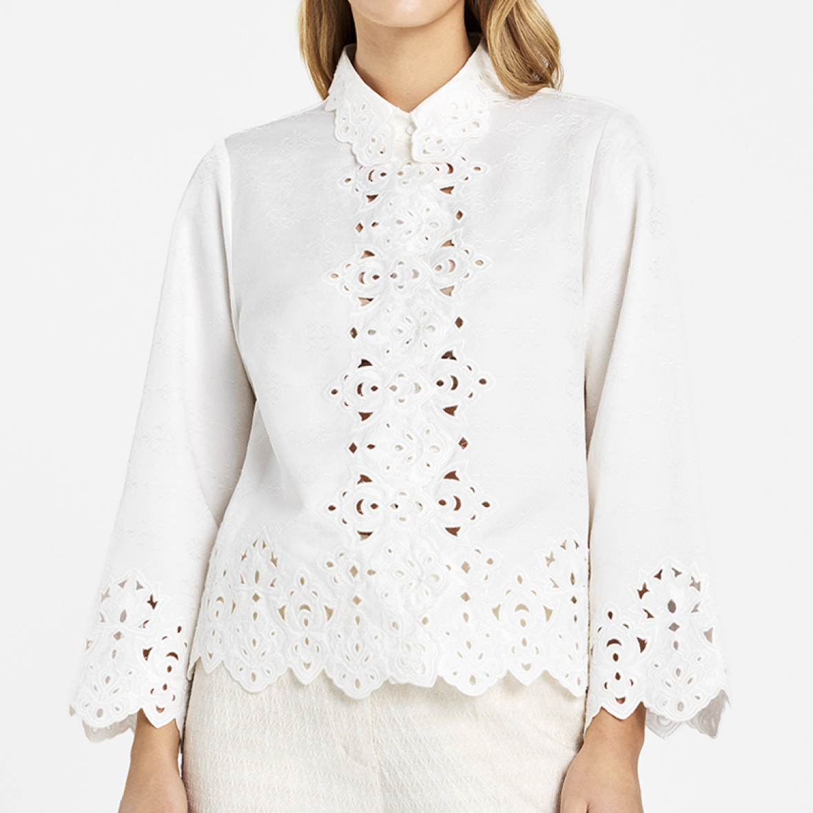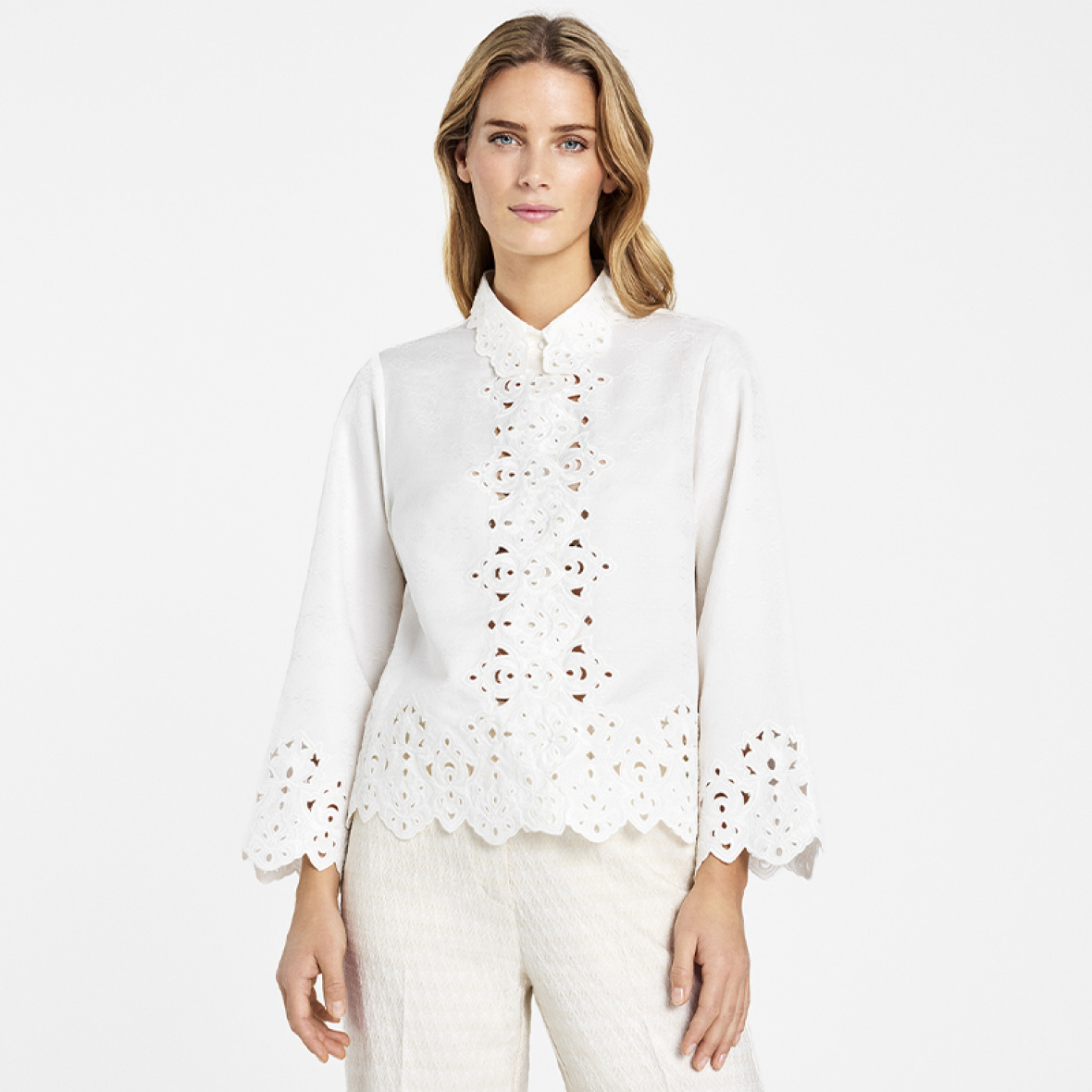 Blusen har klassisk krave, en let a-formet silhuet og et feminint udtryk skabt af de fine udskæringer.