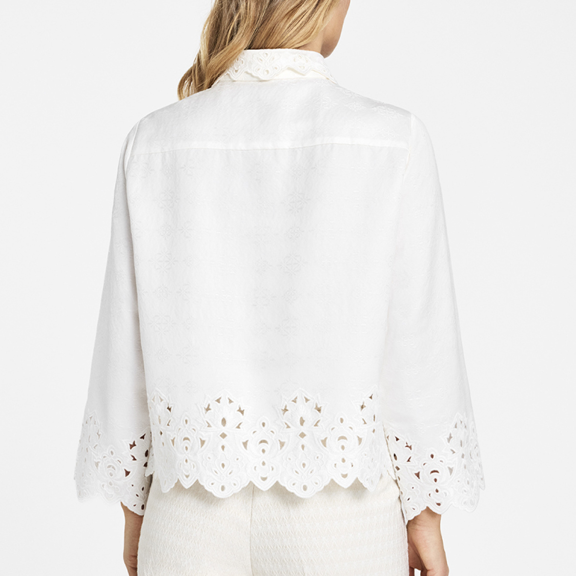 Smuk hvid bluse med dekorative broderie anglaise-detaljer langs front, kant og ærmer.