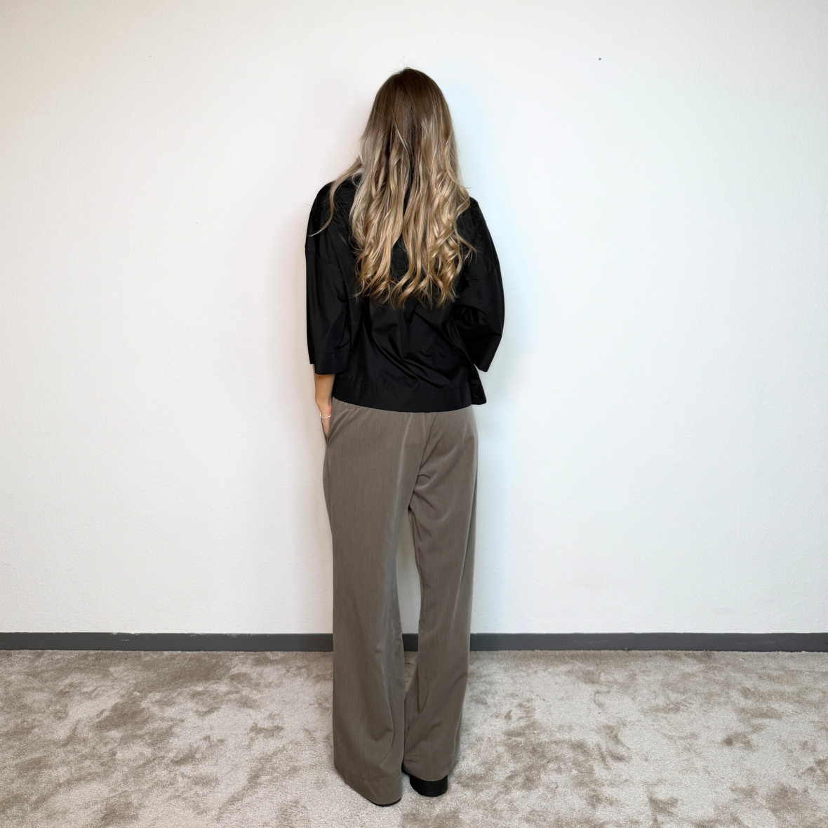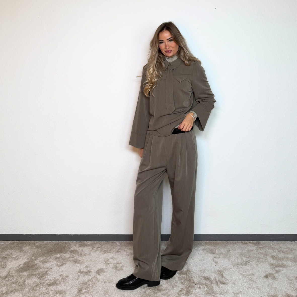 Bukserne har en afslappet pasform med brede ben og fine læg foran, som giver et elegant og moderne udtryk.