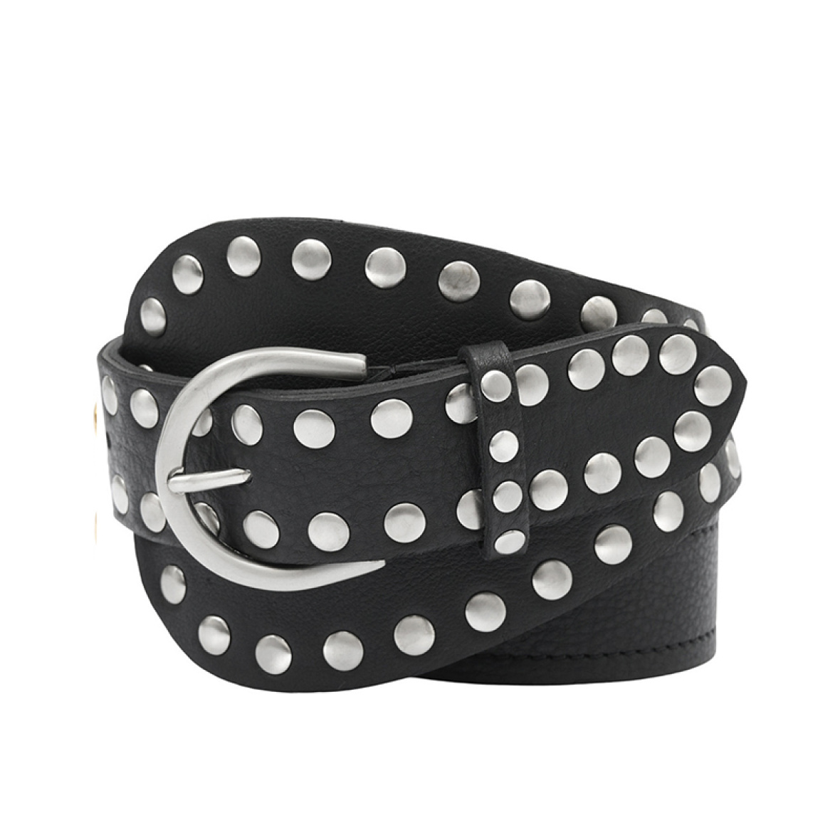 Bæltet er dekoreret med sølv nitter og har et flot spænde i matchende guldfarve.