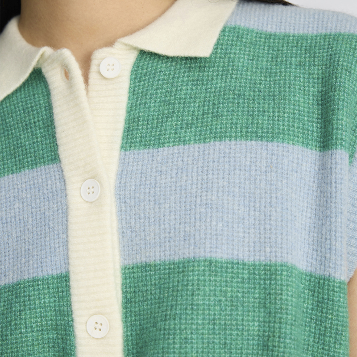 Den er designet med kontrastkrave og kort knappelukning foran.