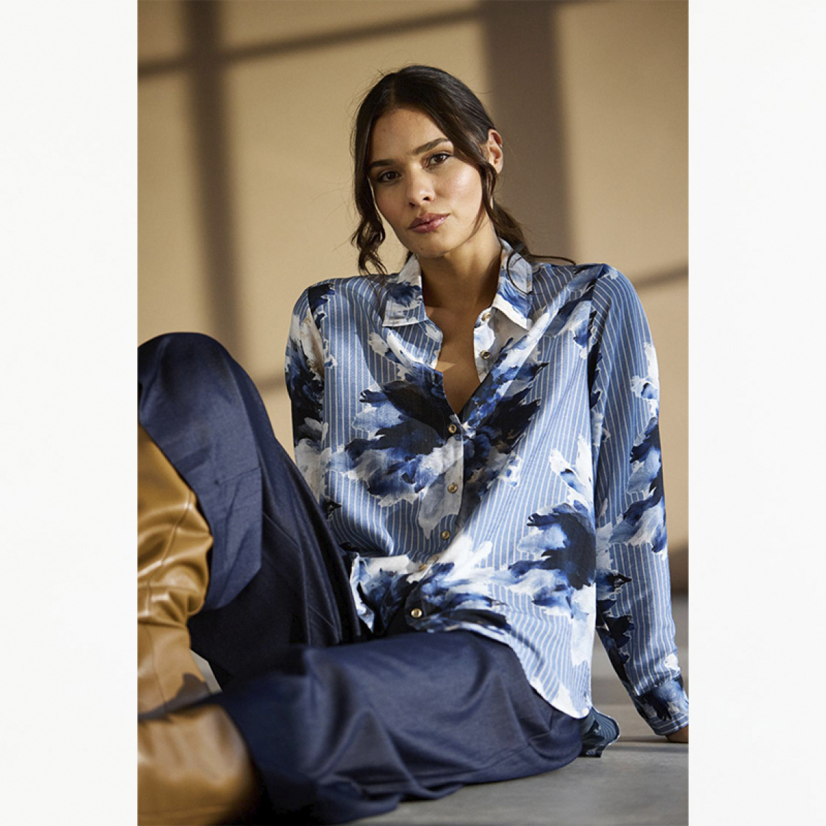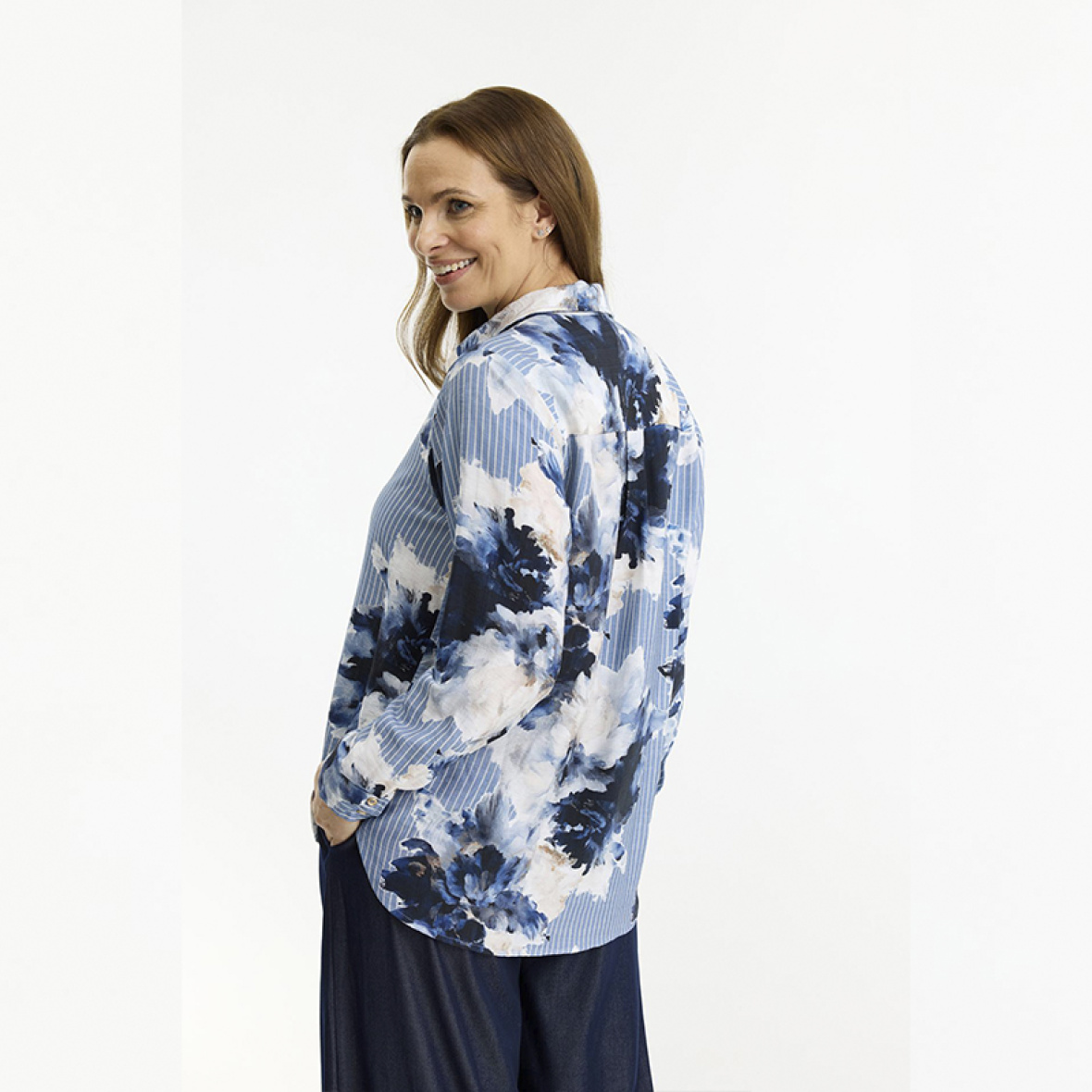 Ofelia skjorte fra In Front er en let og feminin skjorte med et smukt blåt blomsterprint kombineret med fine striber.