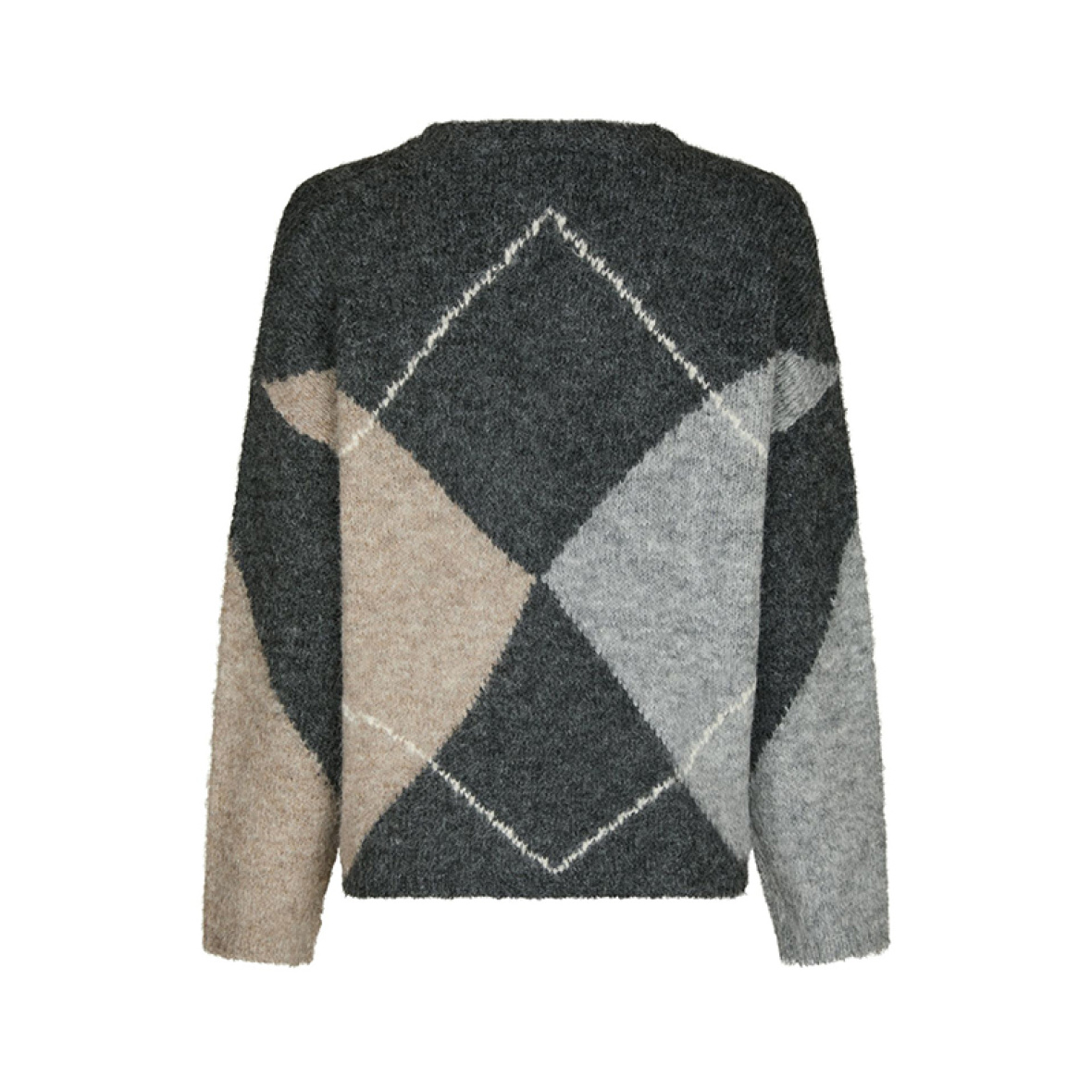Strikken har rund hals og lange ærmer med raglan-effekt.