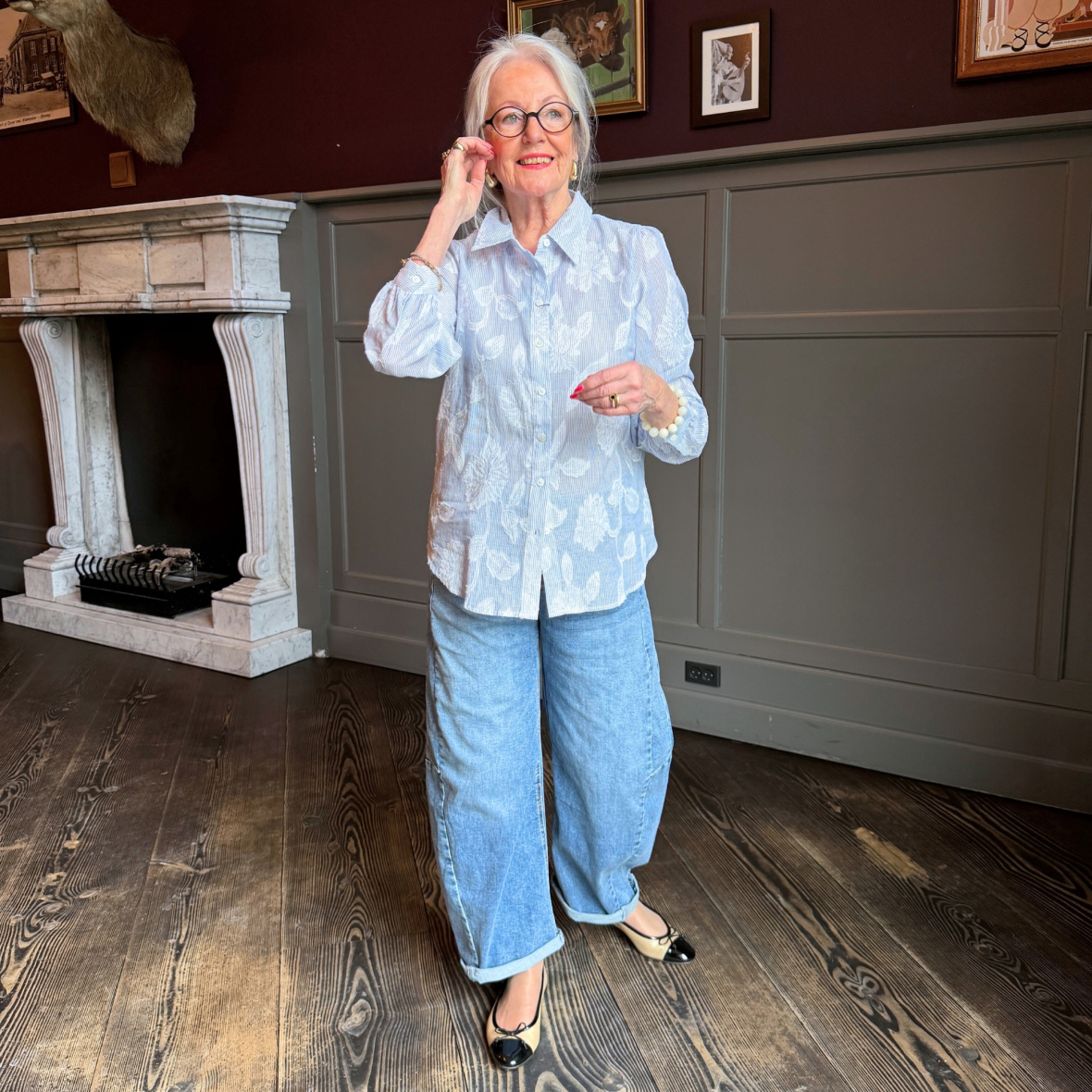 Muller skjorte er en let og klassisk skjorte i lyseblå med fine striber og et diskret blomsterprint.