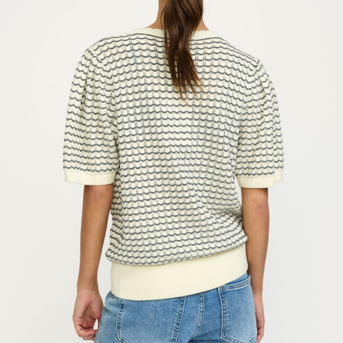 Soft Rebels Mayan strik er en fin og feminin kortærmet strik med et dekorativt mønster i smukke, afdæmpede nuancer.