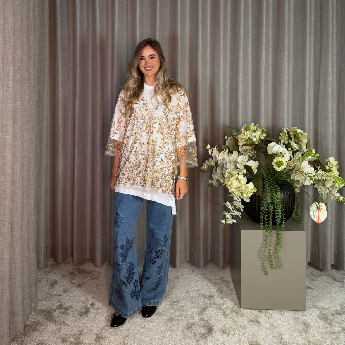 Top fra Munthe i let og transparent kvalitet med pailletter og perler i et gyldent bladmønster.