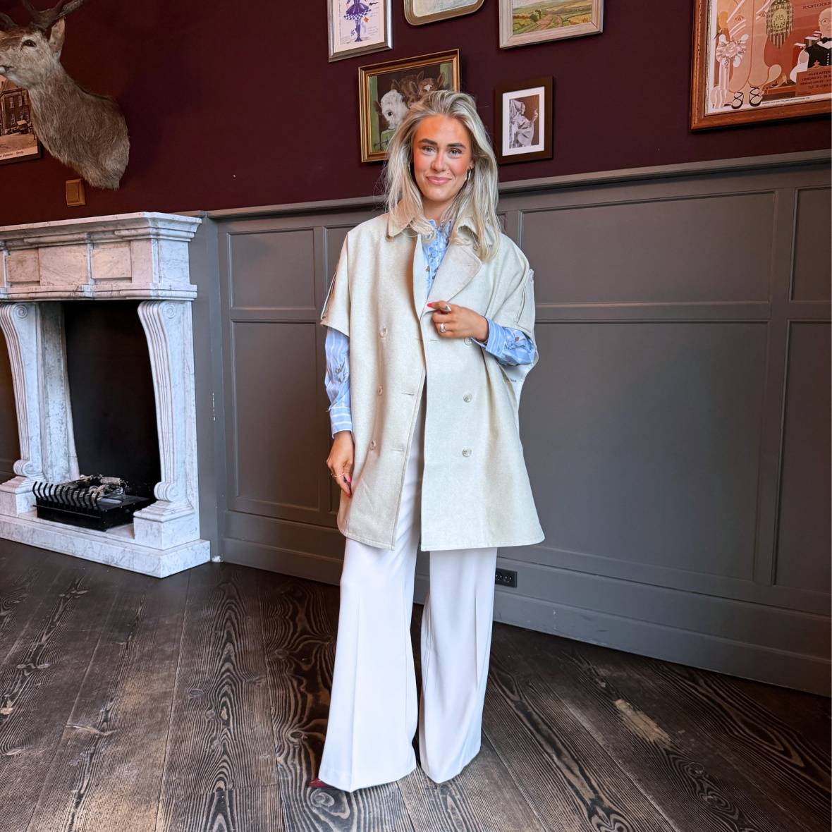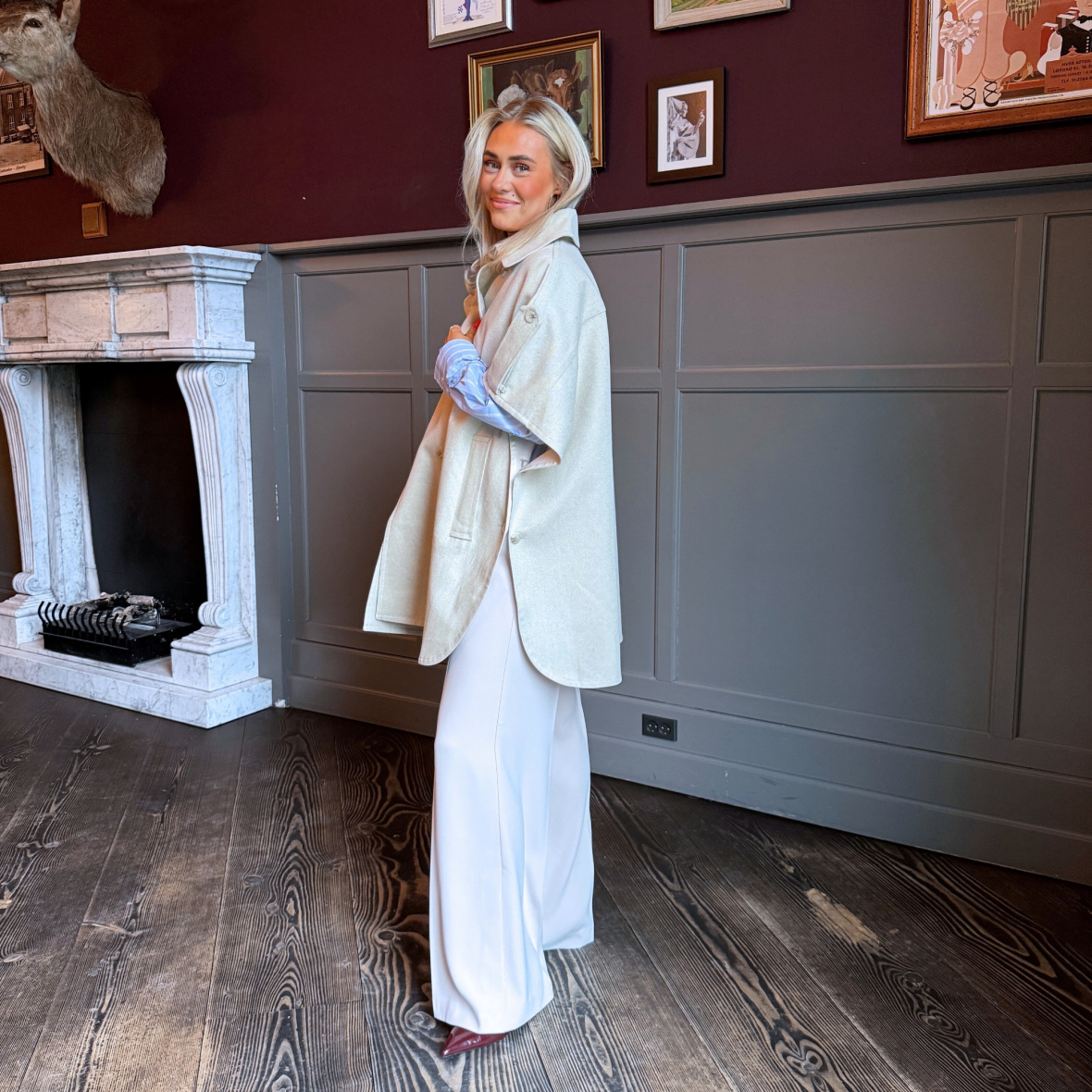 Capen fungerer perfekt som et ekstra lag og tilfører outfittet et stilrent og feminint touch.