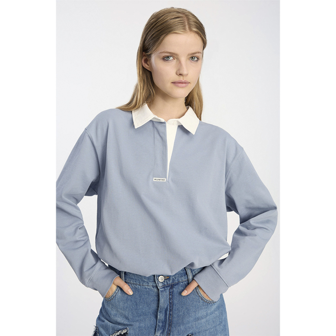 Becent polo sweatshirt fra Munthe i en smuk, støvet blå nuance.