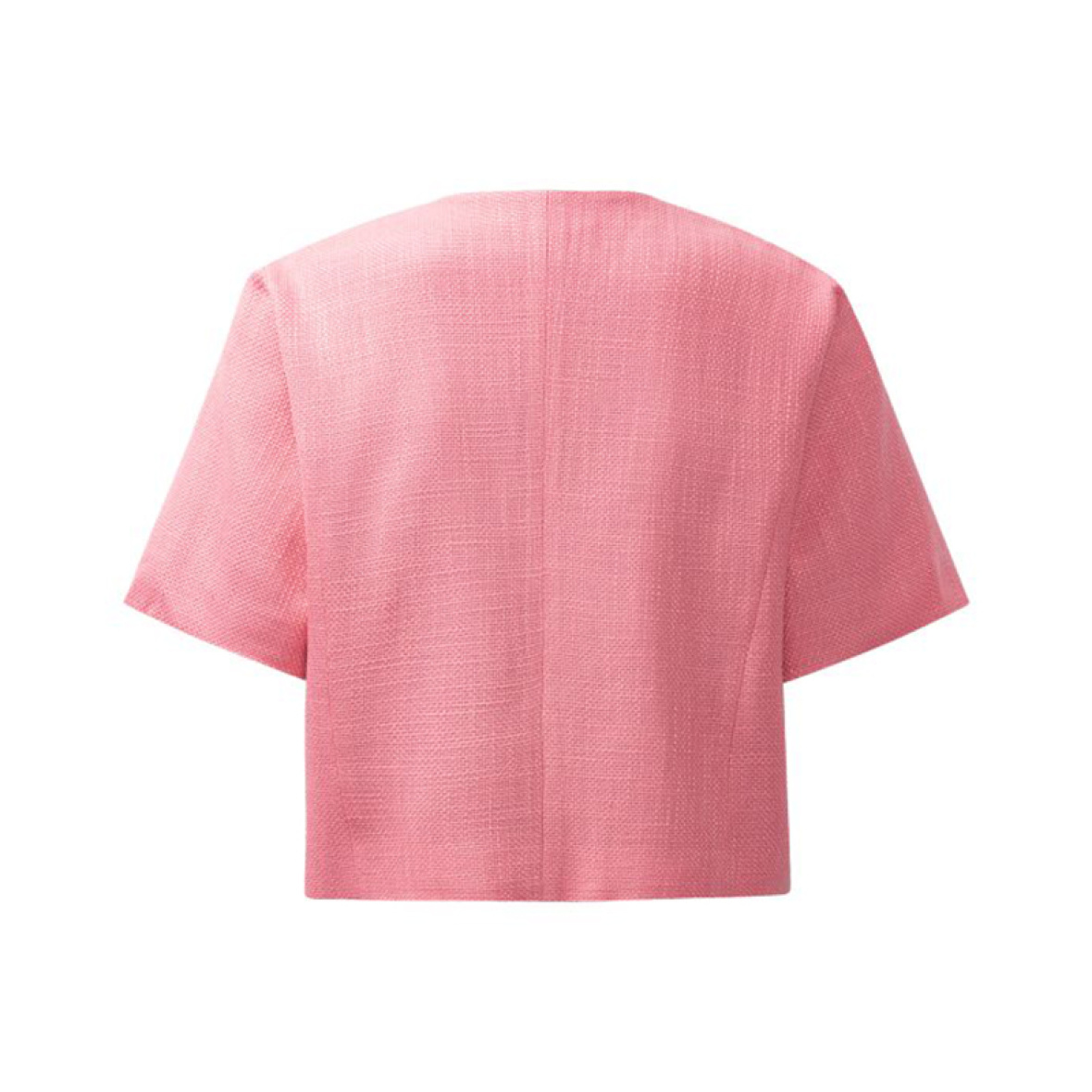 Den har korte ærmer og en cropped længde, som giver et feminint og moderne udtryk.