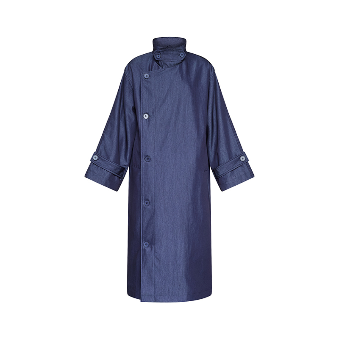 Frakken har høj krave og asymmetrisk knaplukning foran, som giver et cool og minimalistisk look.
