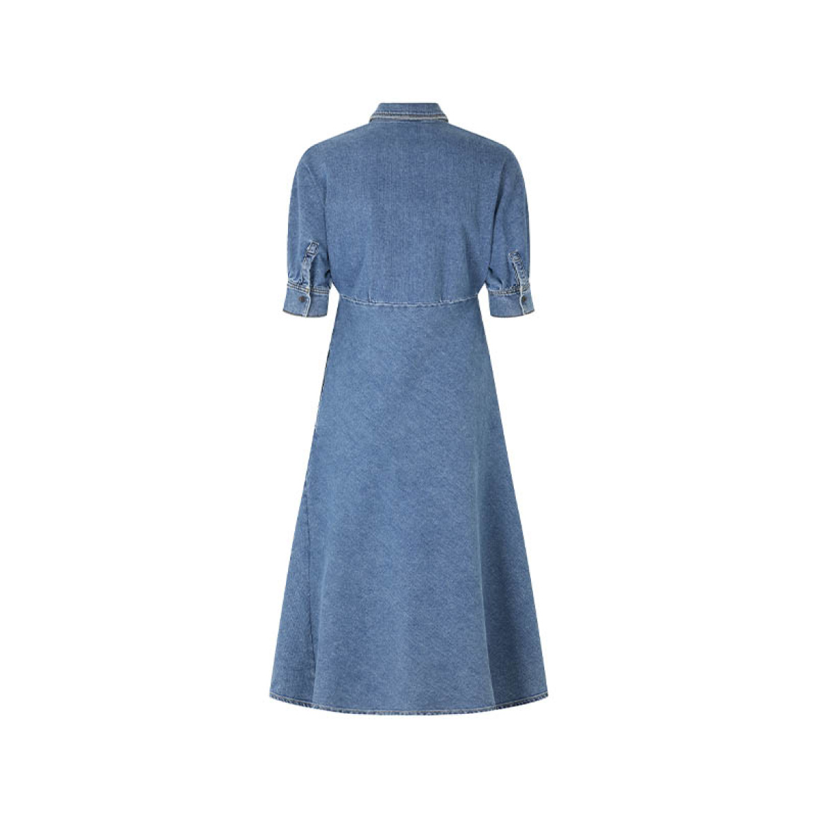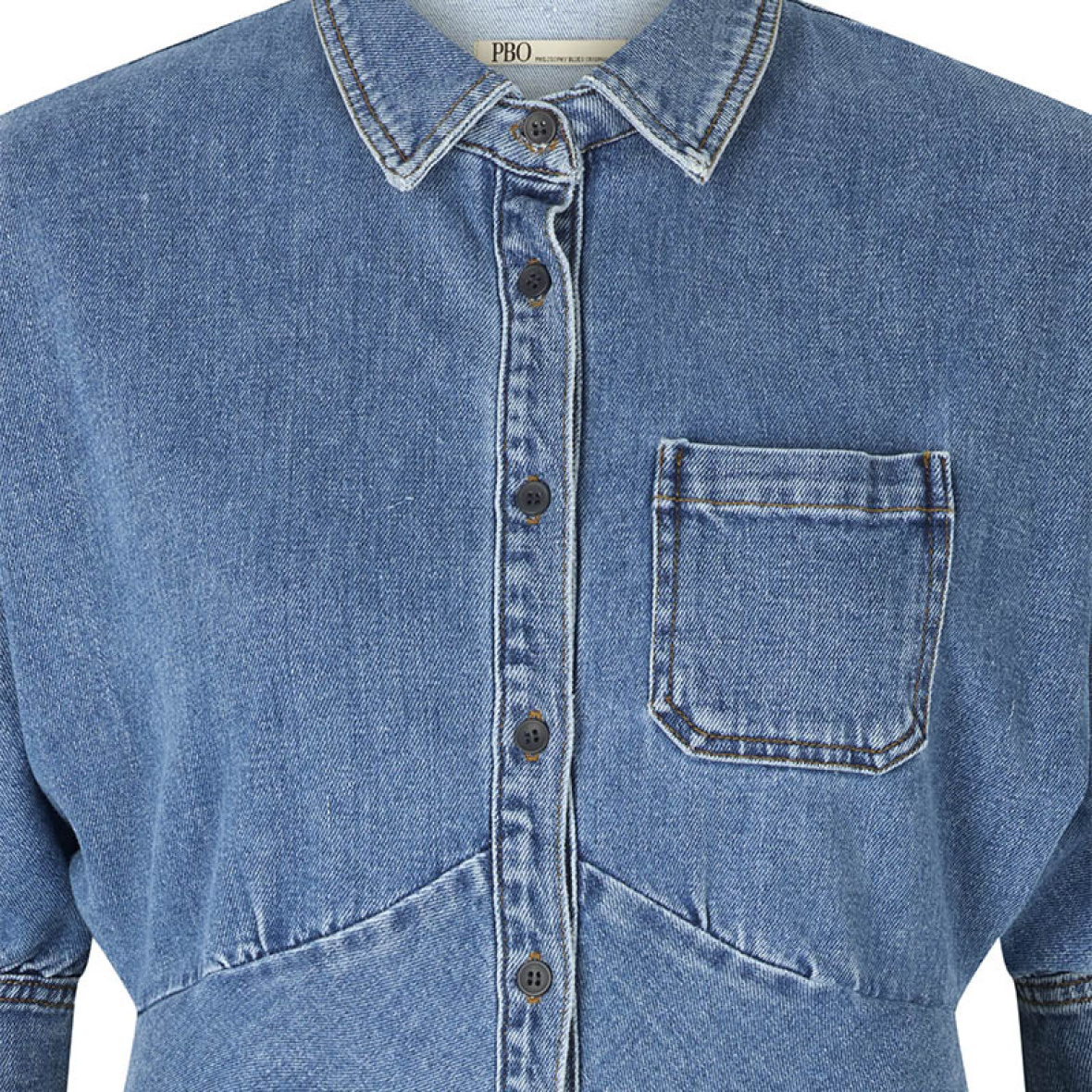 Denne denimkjole fra pbo kombinerer et klassisk skjortelook med en feminin silhuet.