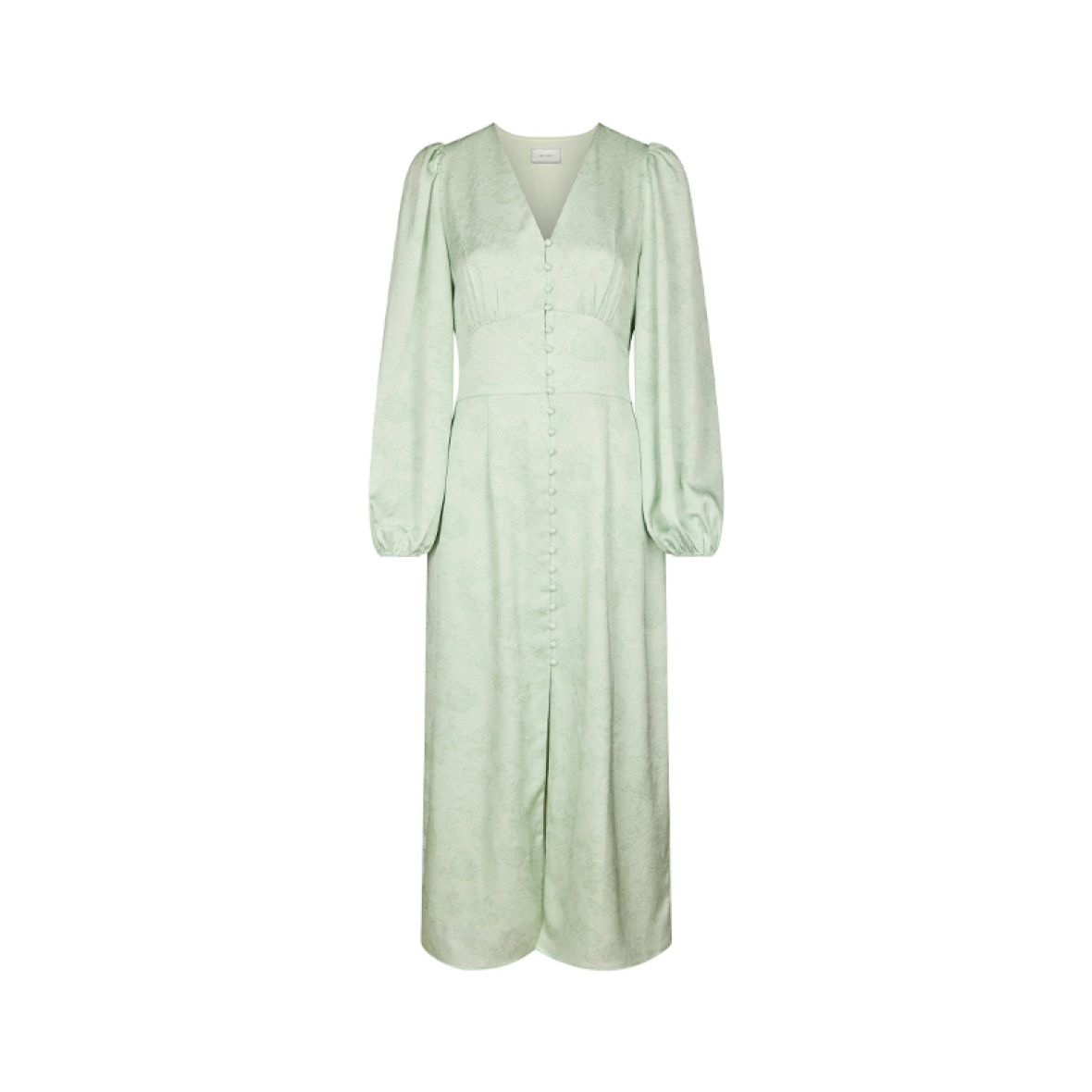 Neo Noir Alto pattern kjole er en feminin og elegant kjole i en lys grøn nuance med diskret tone-i-tone mønster.