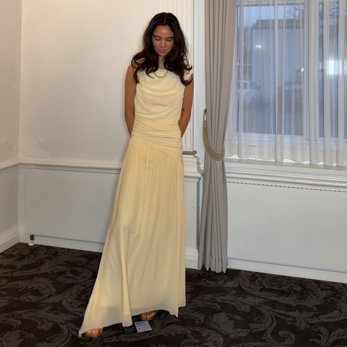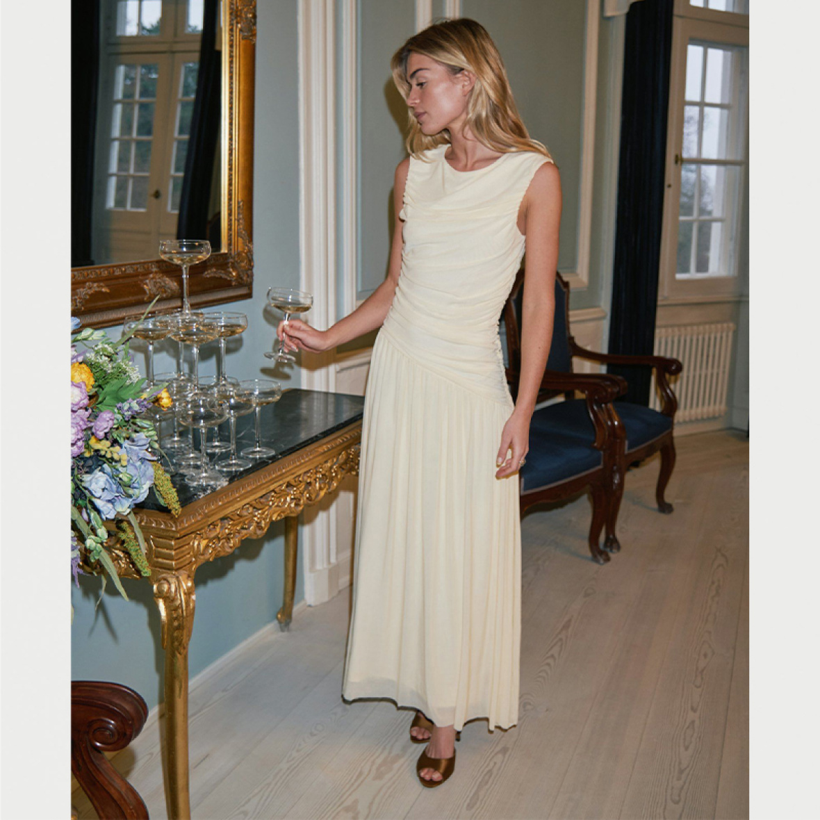 Kjolen har et let og luftigt fald, der skaber bevægelse.