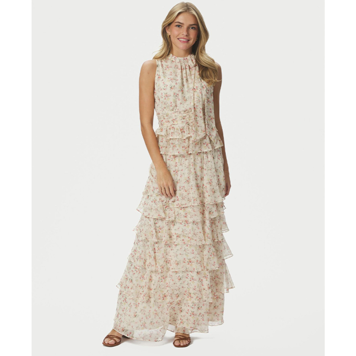 Nederdelen er designet i flere lag med fine flæsedetaljer, som giver et elegant og levende fald.