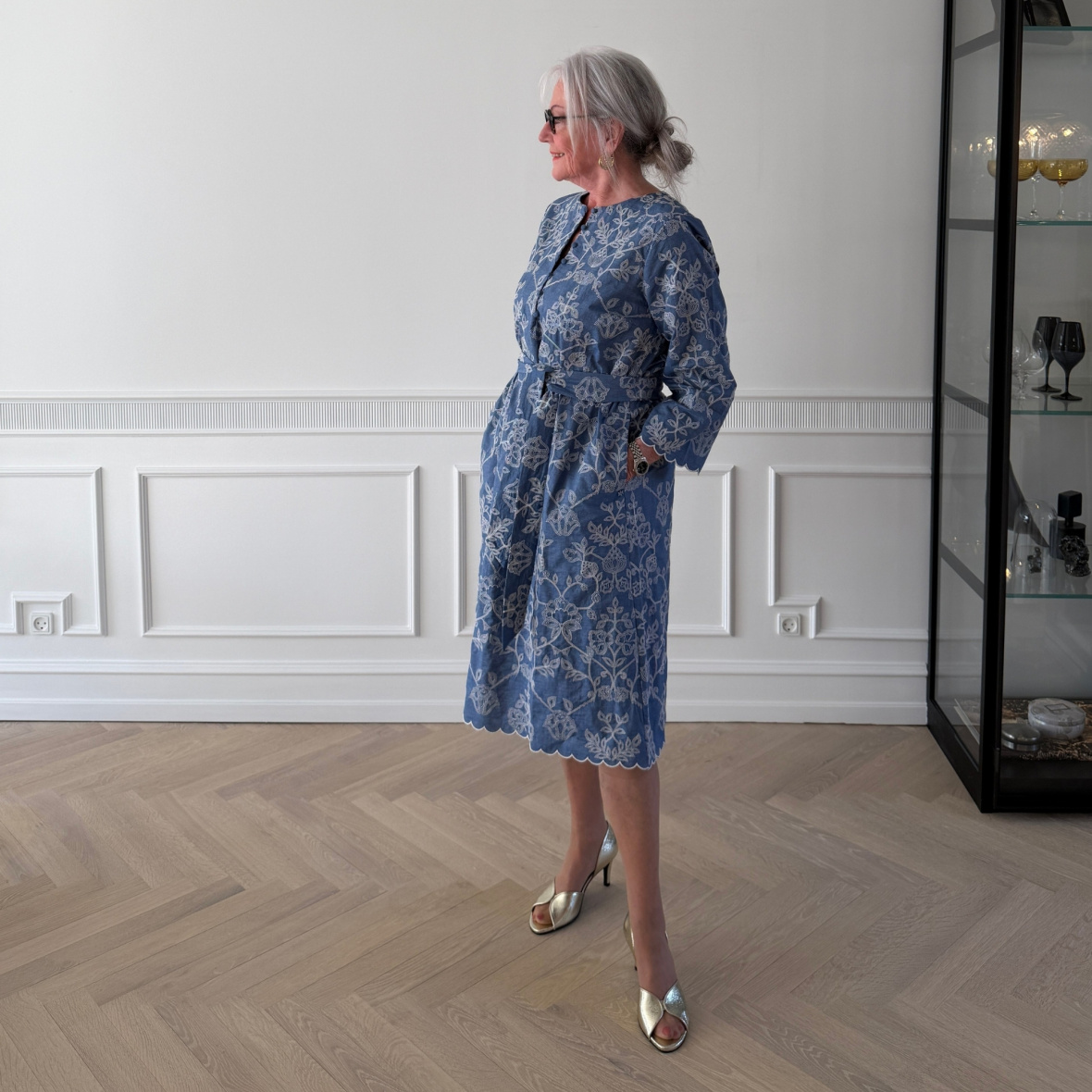 De trekvartlange ærmer afsluttes med en fin bølgekant, som går igen langs kjolens nederste kant og tilfører et let og romantisk look.