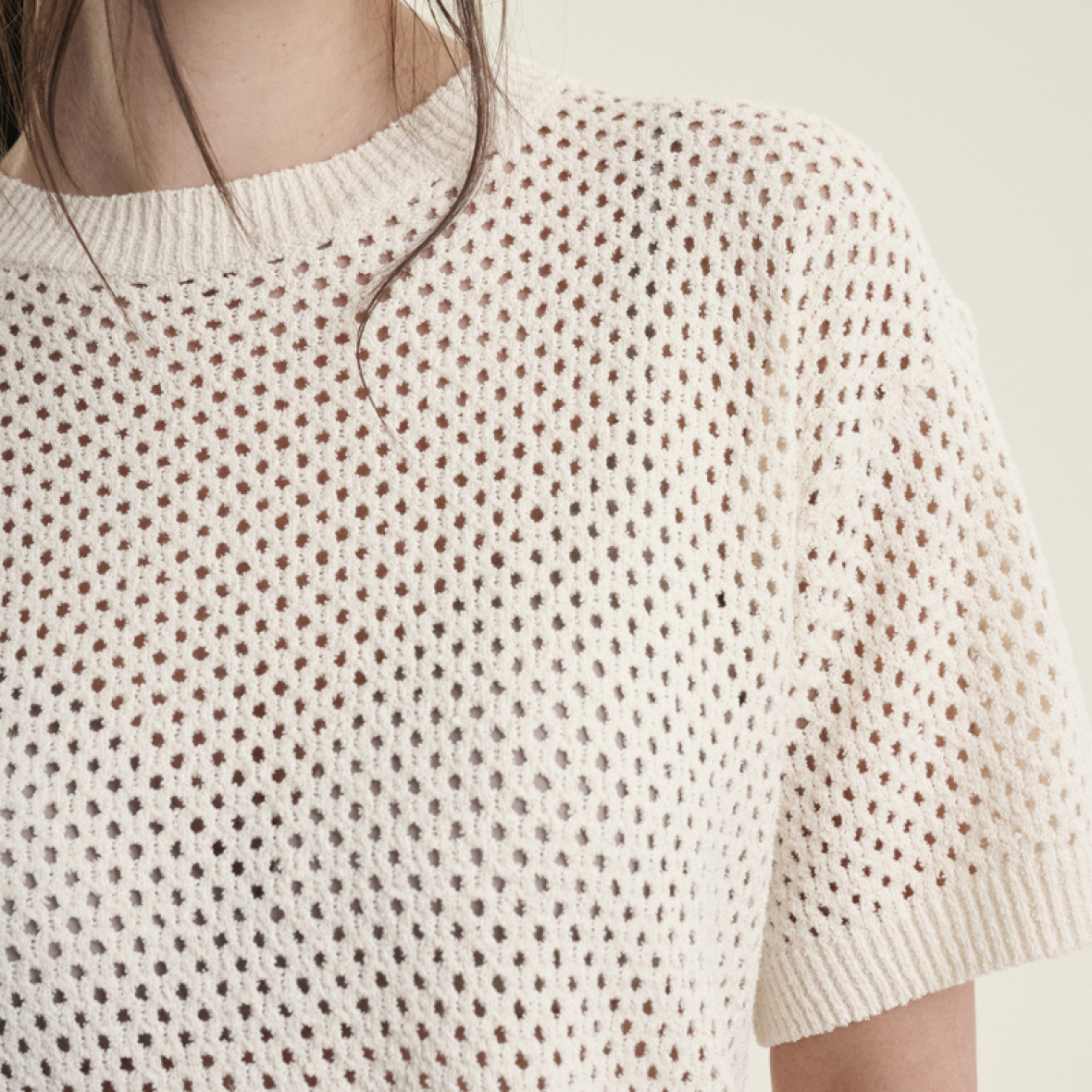 Strikbluse med fint hulmønster, der giver et let og elegant udtryk.