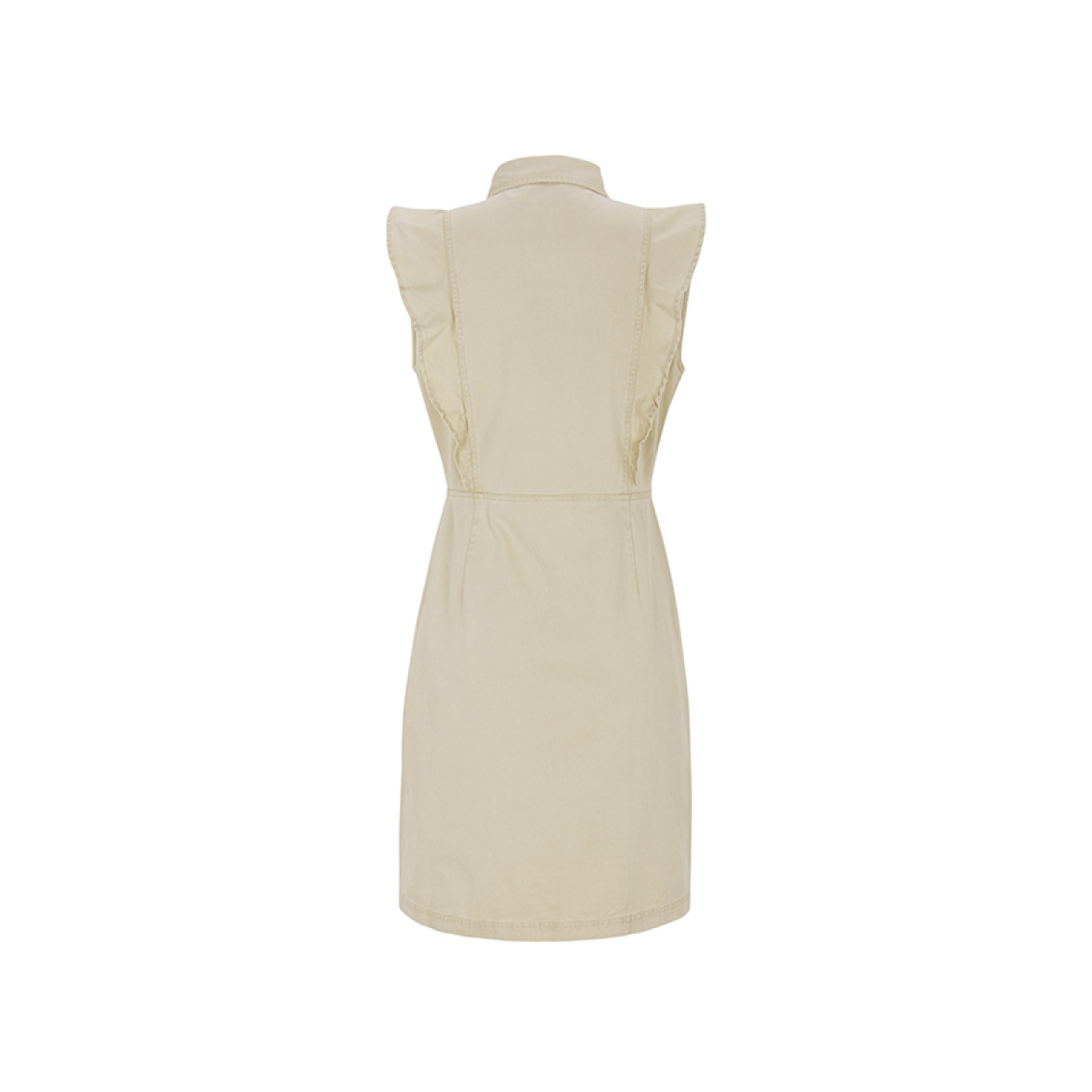 Kjolen har klassisk krave og gennemgående knaplukning, som giver et stilrent udtryk.
