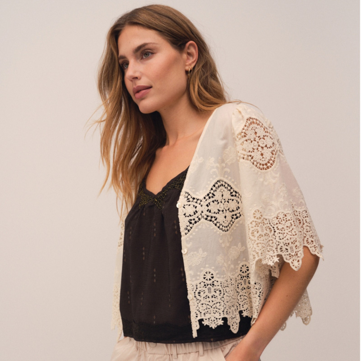 Modellen er kort og designet med store, markante blondedetaljer, som giver et særligt og elegant look.