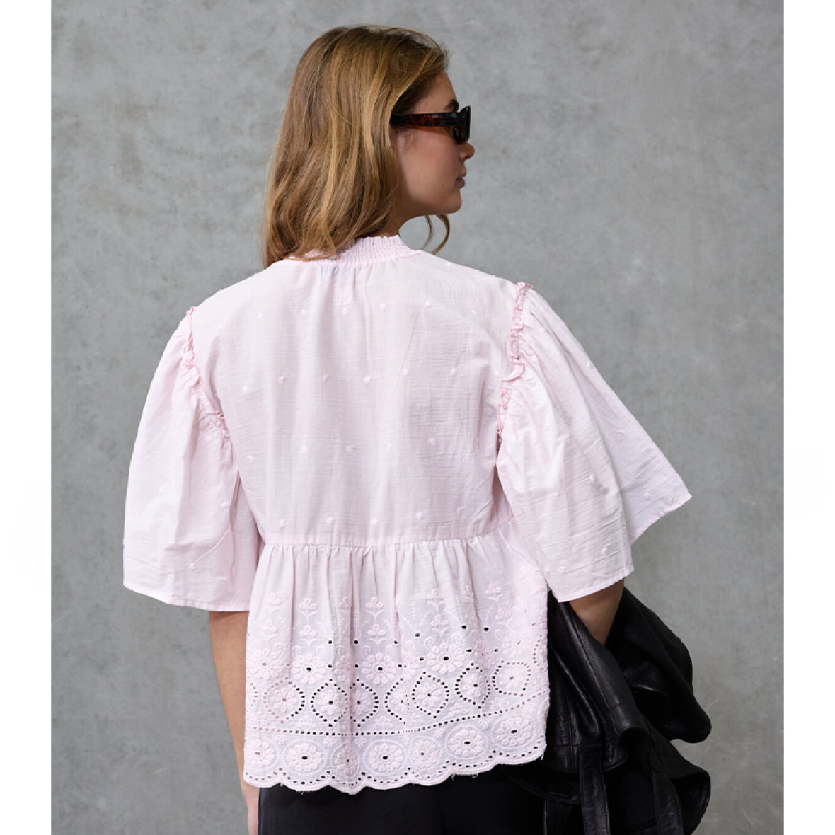 Modellen er designet med smukke broderie anglaise-detaljer og en flot peplum, som fremhæver taljen.